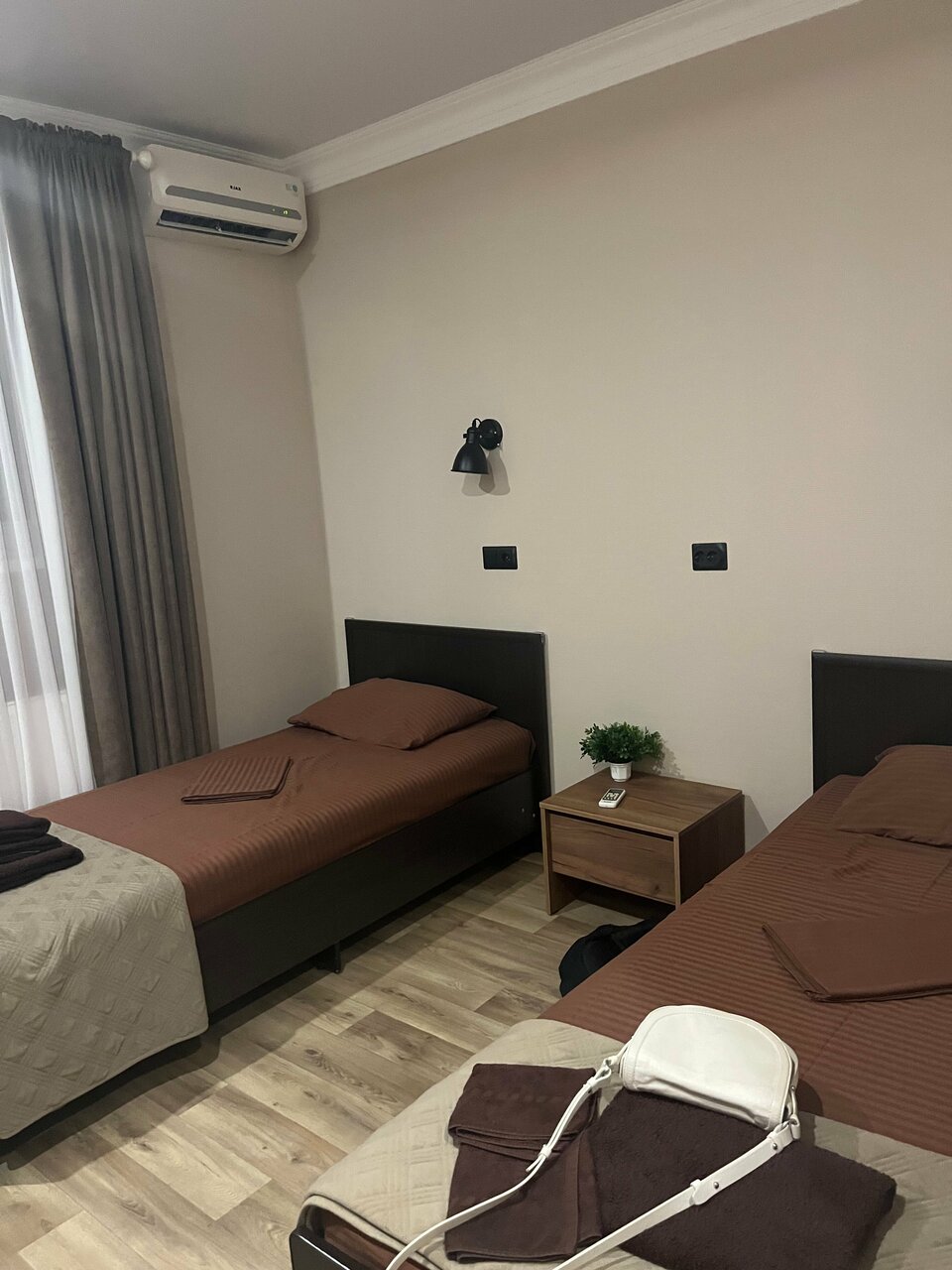 Однокомнатный номер. С двумя односпальными кроватями. В номере имеется холодильник, чайник.ТВ,Wi-Fi. Санузел в номере.