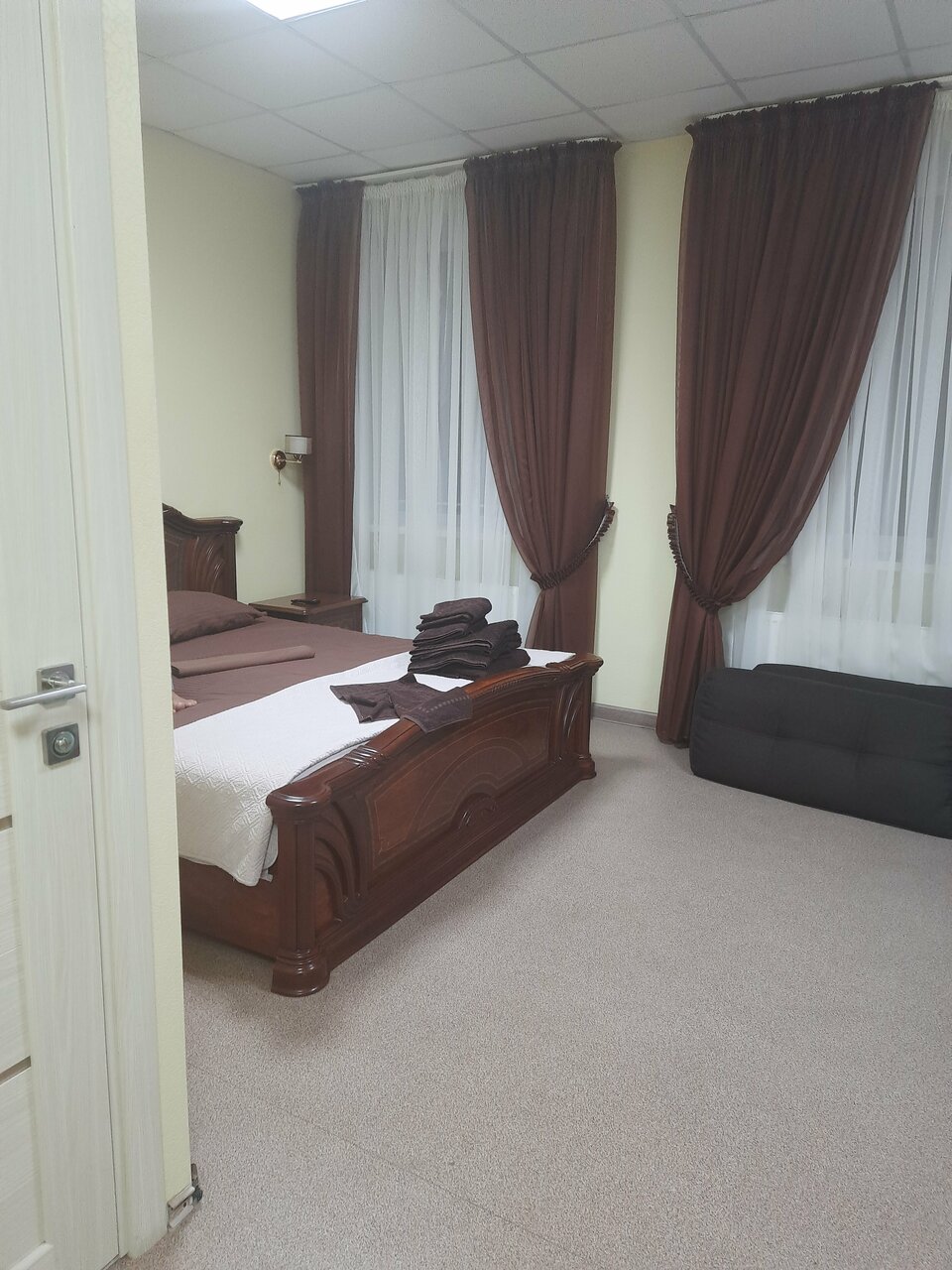 Двухкомнатный номер,с двуспальной кроватью. И возможностью предоставления доп.места в гостевой комнате.Холодильник, чайник, обогреватель,мягкая мебель для отдыха и журнальный столик в гостевой.ТВ,Wi-Fi. Санузел в номере.