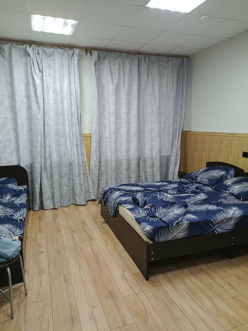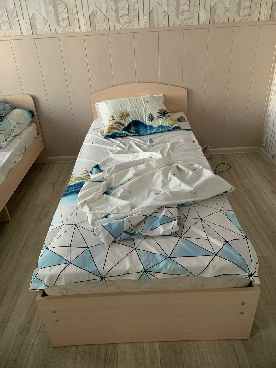 За одно спасибо — нашлось место для ночлега . В остальном всё печально : постель имеет спертый запах, который преследовал нас до следующей гостиницы. Постельное 100% синтетика, от этого тело как после душа всю ночь в поту . В душе лейка сломана, и встретились усатые ‘друзья’. В общем только от безвыходности туда (((