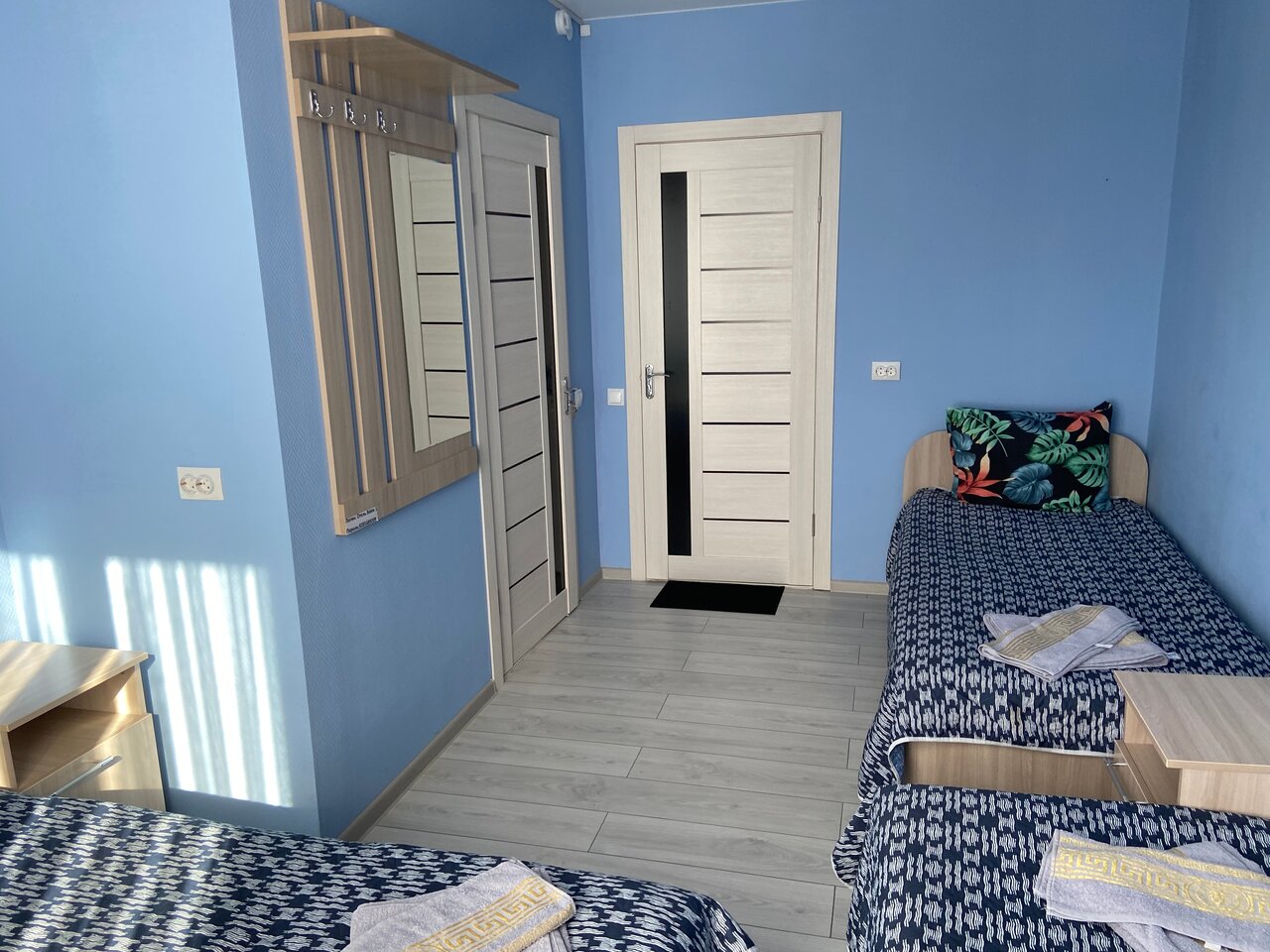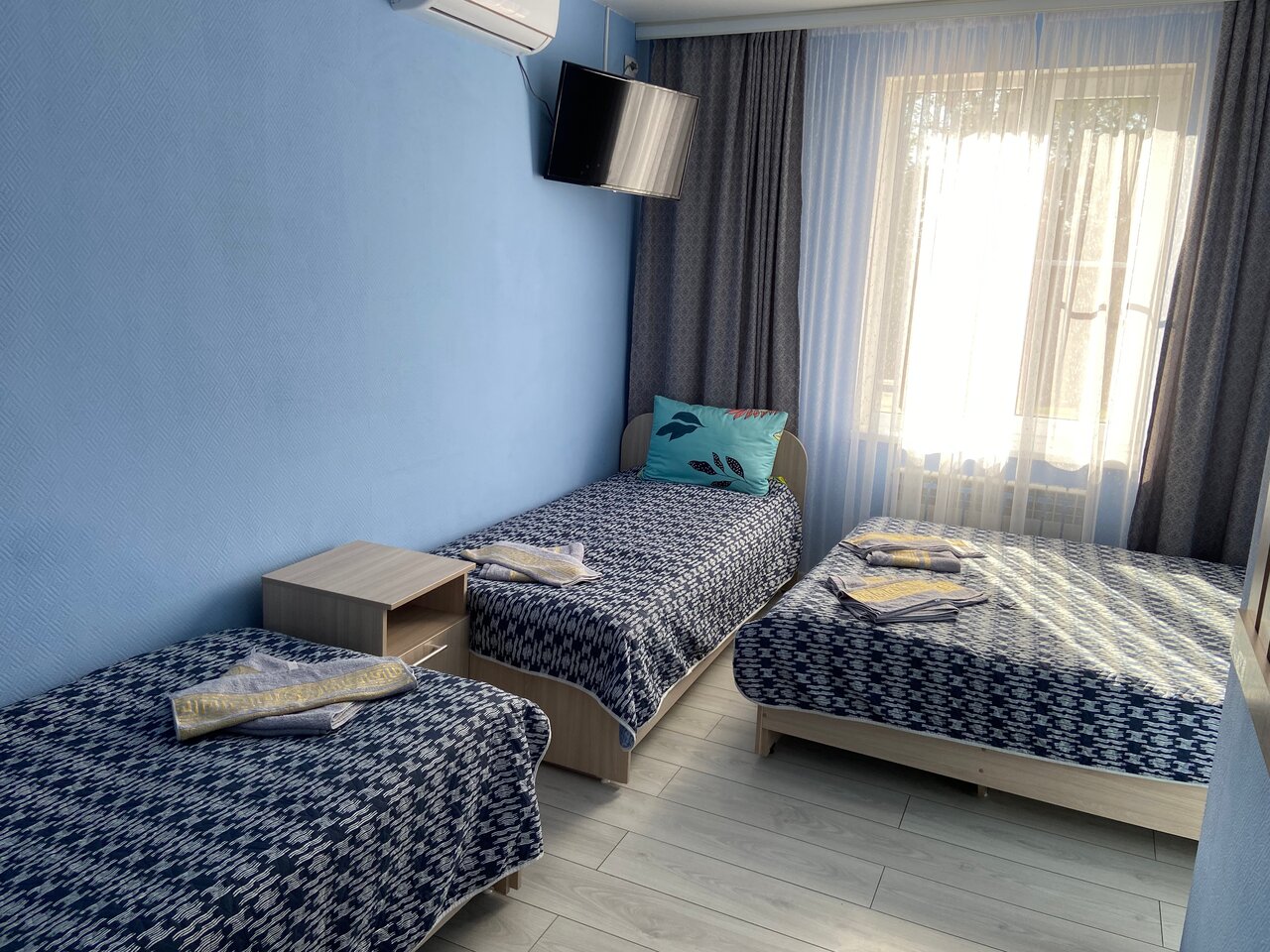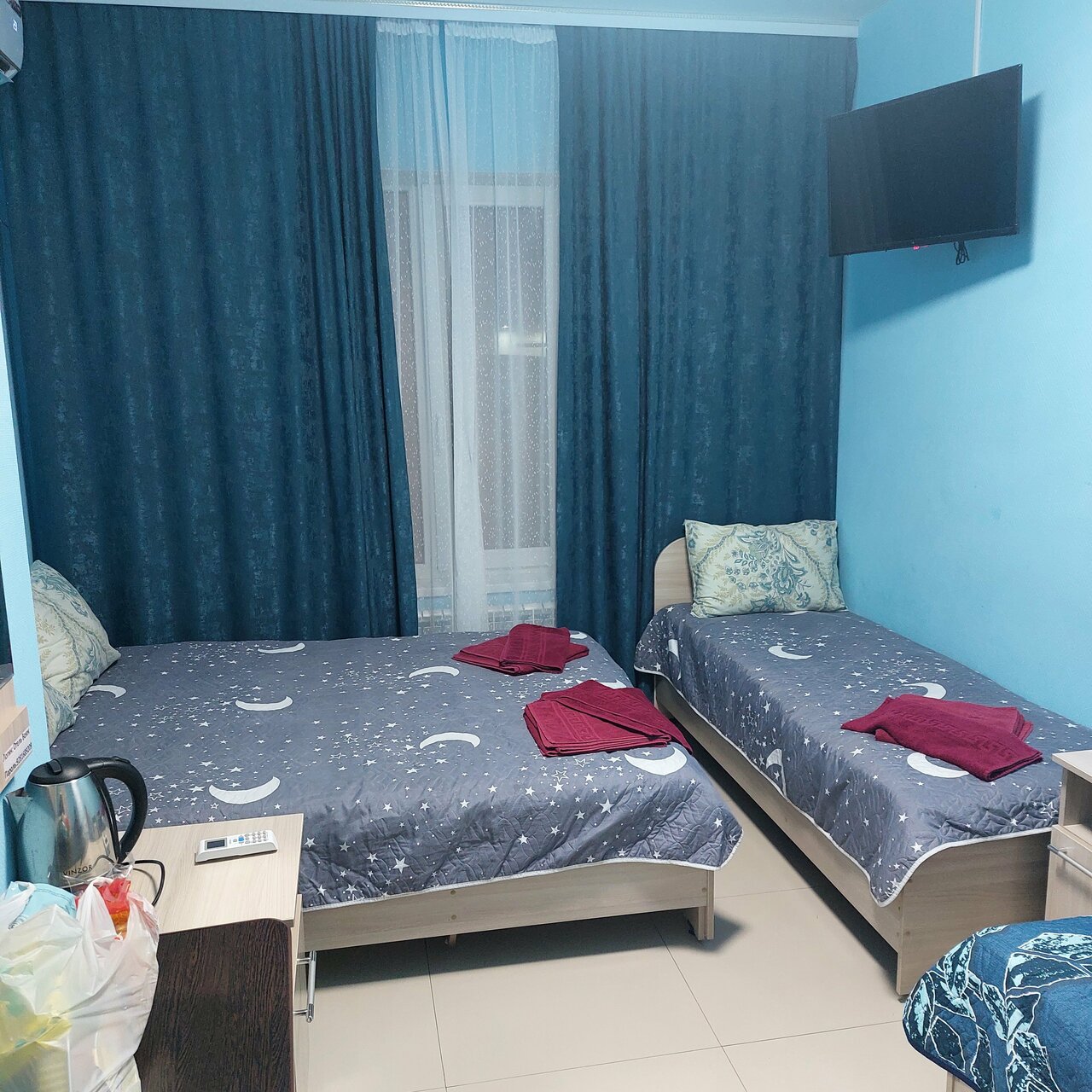 В номерах чисто, санузел в номере, кондиционер, телевизор, чайник, кровати очень удобные, на первом этаже есть кулер и холодильник, администраторы вежливые. Рядом магазины.