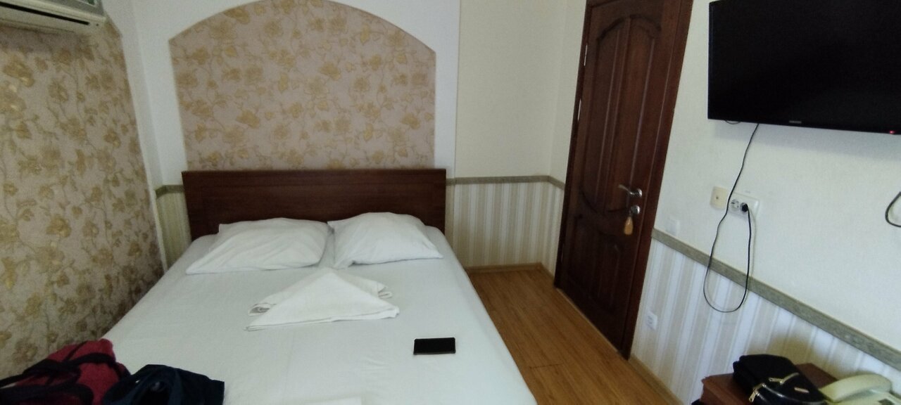 В номере чисто, есть кондиционер, телевизор, постельное и полотенца свежие, туалет и душ в номере, так же есть одноразовые мыло и шампунь. Кровать скрипт. Порадовал душ, вода бежит горячая и хороший напор. Гостиница уже уставшая. А в целом не плохо, чтоб поспать одну ночь и помыться с дороги.