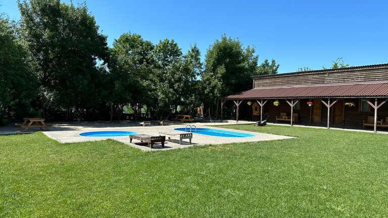 Неплохой вариант для семьи с детьми и на машине. За пропитание заботимся сами, ближайшее кафе 9 км. Бассейн отличный.