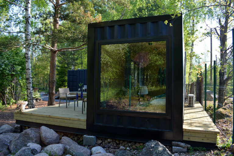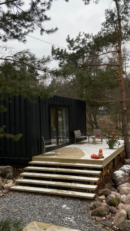 Дом из морского контейнера с панорамными окнами, которые выходят на густой лес и цветочную поляну. На террасе можно застать солнце после обеда — летом будет где укрыться от солнца. Домики из морских контейнеров выполнены в минималистичном стиле ...