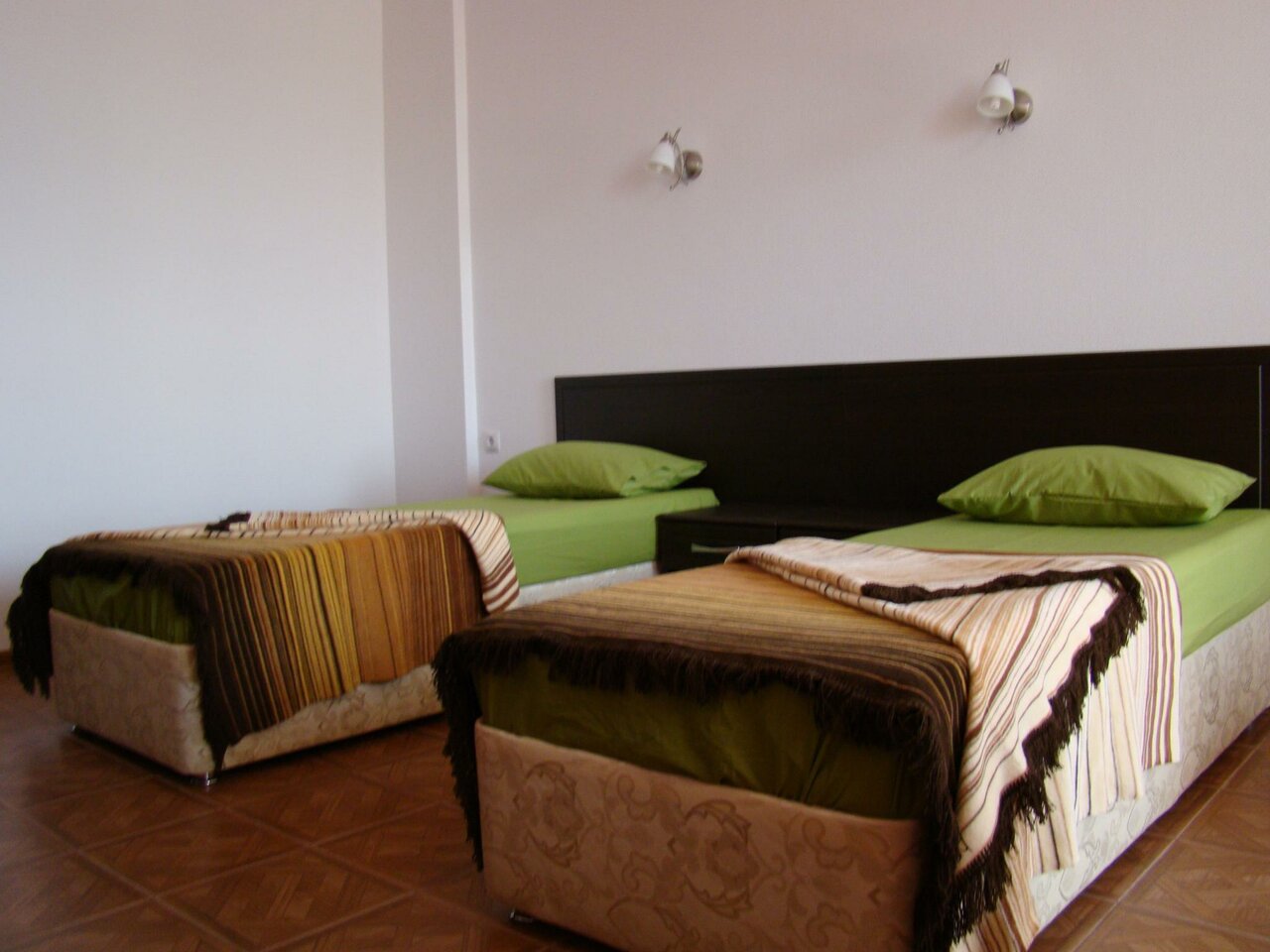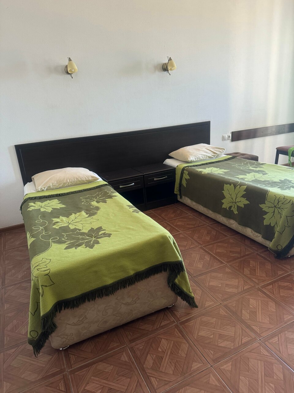 Все номера в гостинице с видом на море)) Персонал вполне адекватный, парковка не далеко, завтраки есть, но на этом, пожалуй, плюсы и закончились))))) Наш номер был на 4м этаже, обычный ремонт, ничего выдающегося (вид, конечно, хорош). На балконах маленький стол и 2 стула… а так же огромное количество повсюду висящих и ползающих пауков различных размеров! Персонал не смахивал паутину уже не одну неделю… И ладно, если бы эти пауки только на балконе обитали, но нет. В номере их тоже предостаточно. Спать на матрасах не возможно. Их пора бы давно уже обновить, чтобы гости не просыпалась ночами от онемения рук и ног. Напор в душе отсутствует. Не душ, а одна маленькая струйка. И всё это, друзья, за 4к сутки… Ну как бы ‘такое себе’. Тройка исключительно за вид.