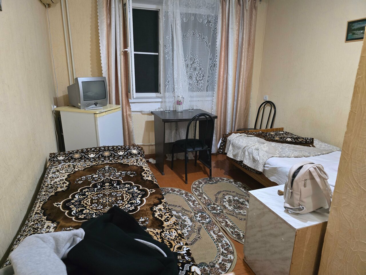 2 односпальные кровати12 м²КондиционерМебельИнтернетРабочее место для ноутбуковРозетка около столаОтоплениеХолодильникДушевая кабинаУнитазЭлектроникаВнешняя территорияВид на городТелевизор