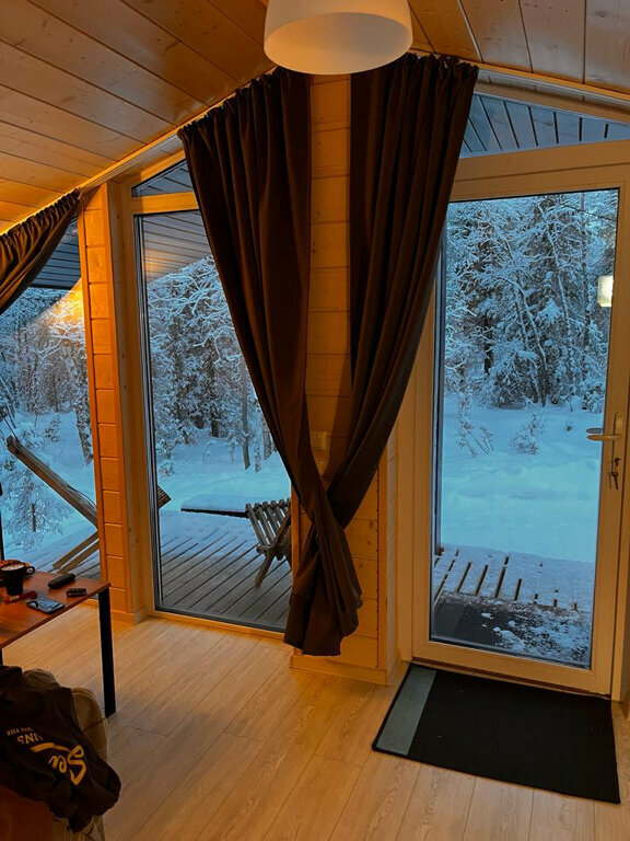 Прекрасное место, сочетающее в себе удалённое от городов расположение в тени деревьев и все блага цивилизации. До домика от ближайшей автобусной остановки всего 5 минут пешком, что делает его идеальным вариантом для путешественников без машины. С другой стороны — на машине сюда тоже не составит труда добраться что от Апатитов, что от Кировска. На другой чаше весов — шоссе поблизости достаточно оживленное, даже в ночные часы машины проезжают мимо с завидной регулярностью и могут помешать кому-то полноценно расслабиться. Для нас это не стало проблемой — в минус 25 окна особо не откроешь, поэтому ни один посторонний звук не потребожил наш покой. Однозначно рекомендую небольшим компаниям это место — вы точно не пожалеете!) П.С. В домике не обнаружилось одноразовых тапок, если ноги мёрзнут — берите с собой свои или тёплые носки)