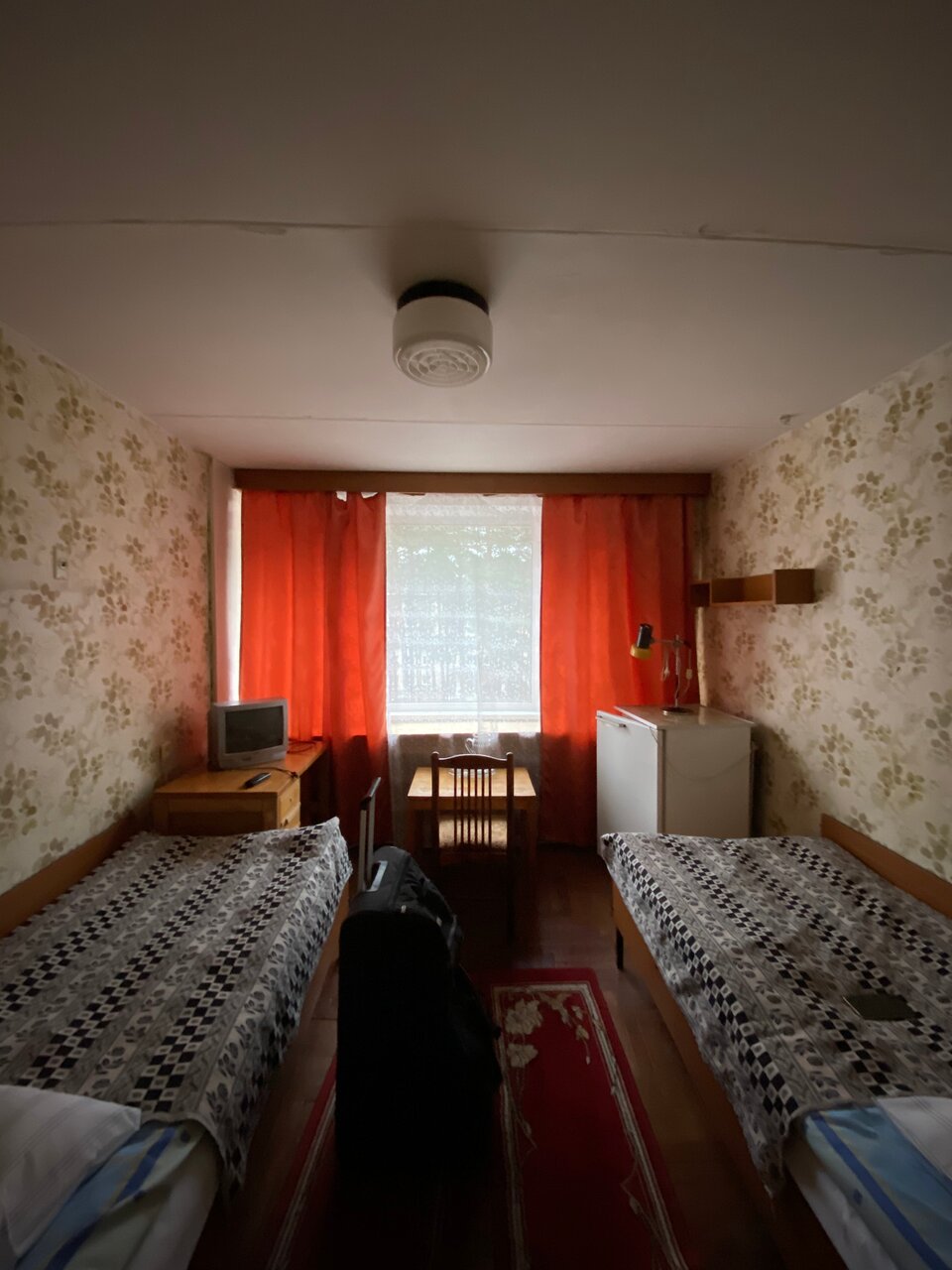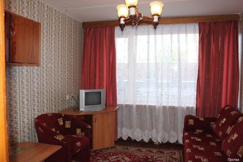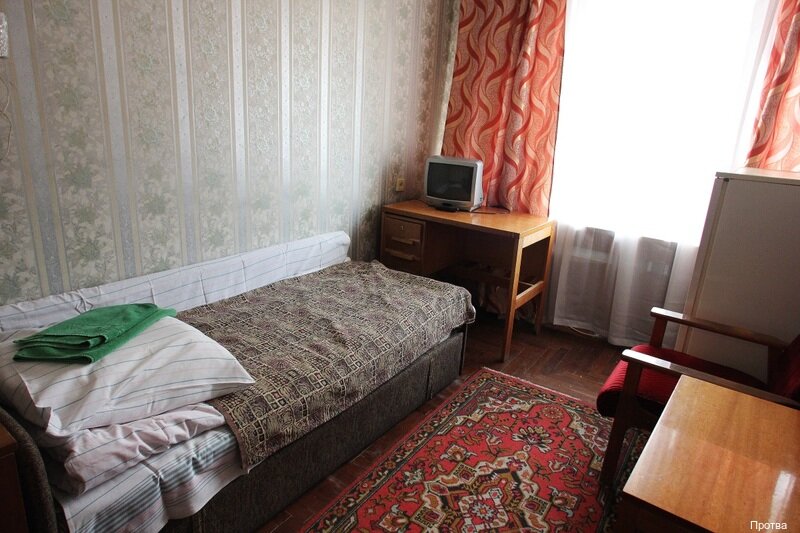 Доступный вариант проживания в Протвино. Мы жили 3000 в сутки за 3х местный номер. Завтраки неплохие — каша, бутерброд, чай. Антураж конечно очень советский. Самый большой минус это дверь в туалет которая открывается внутрь. Выйти из туалета — тот ещё квест.