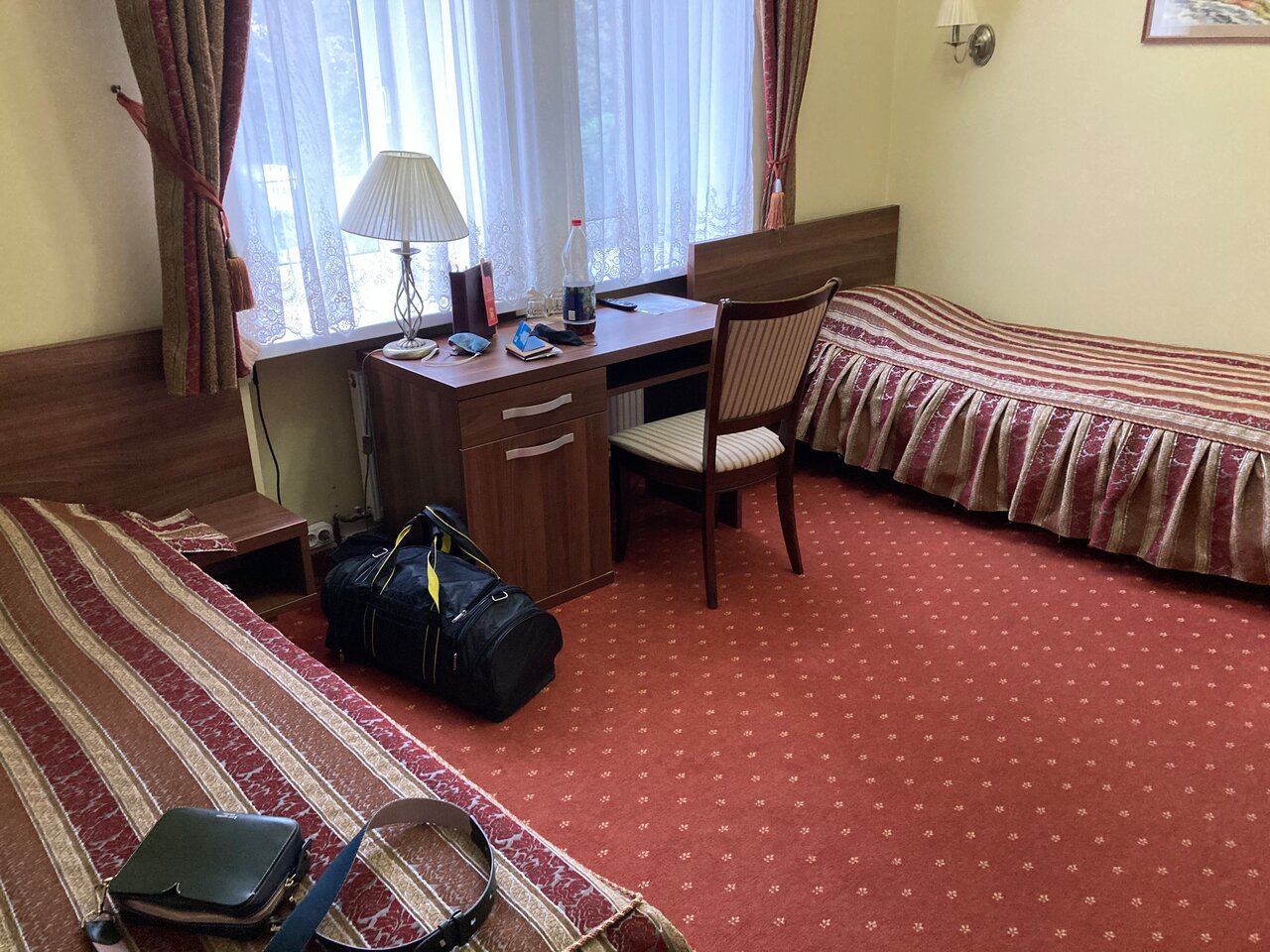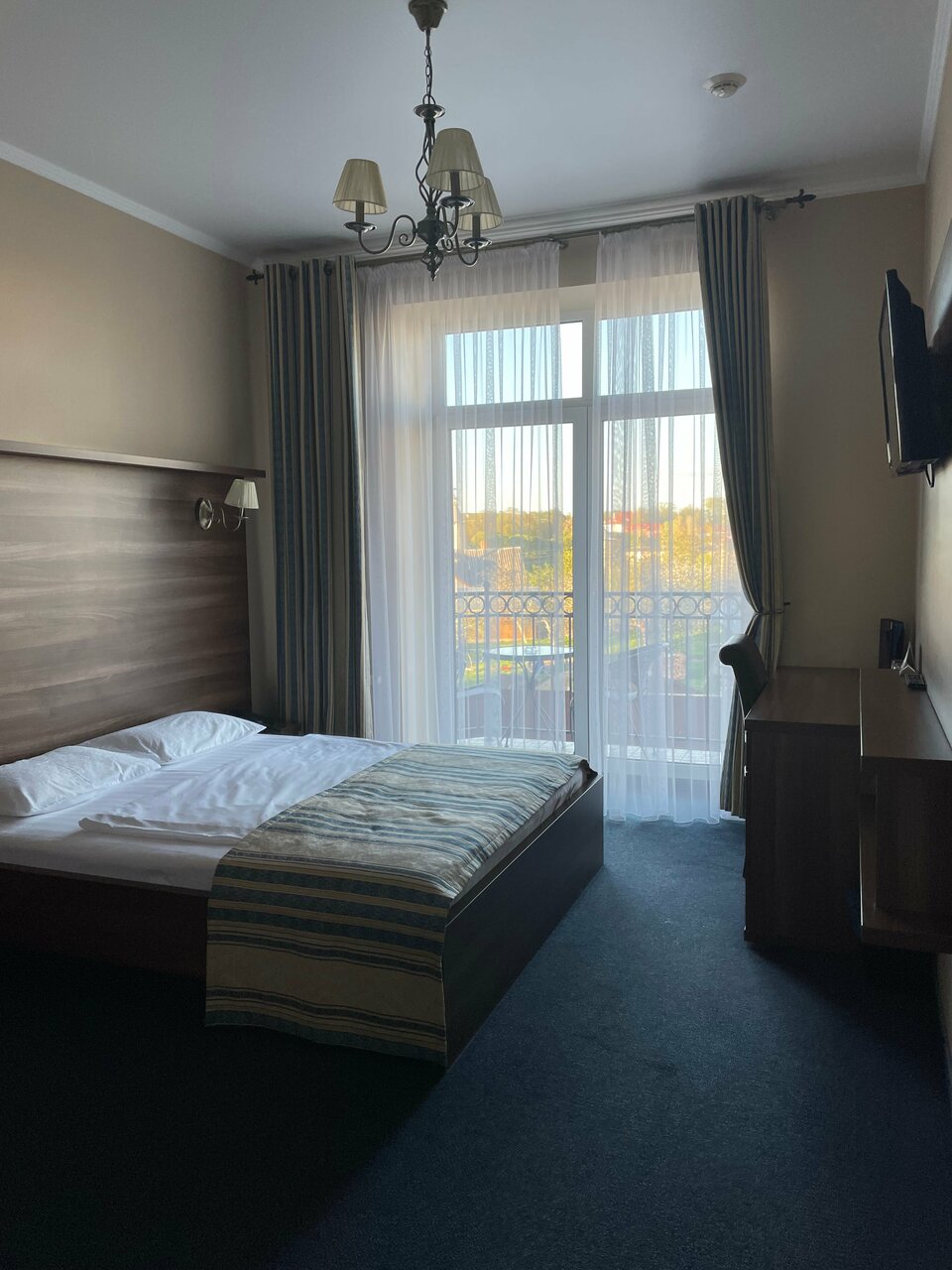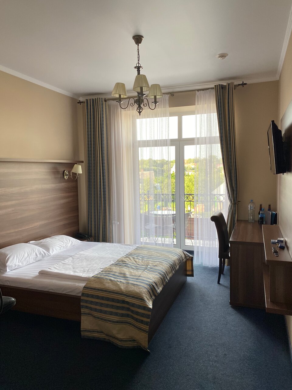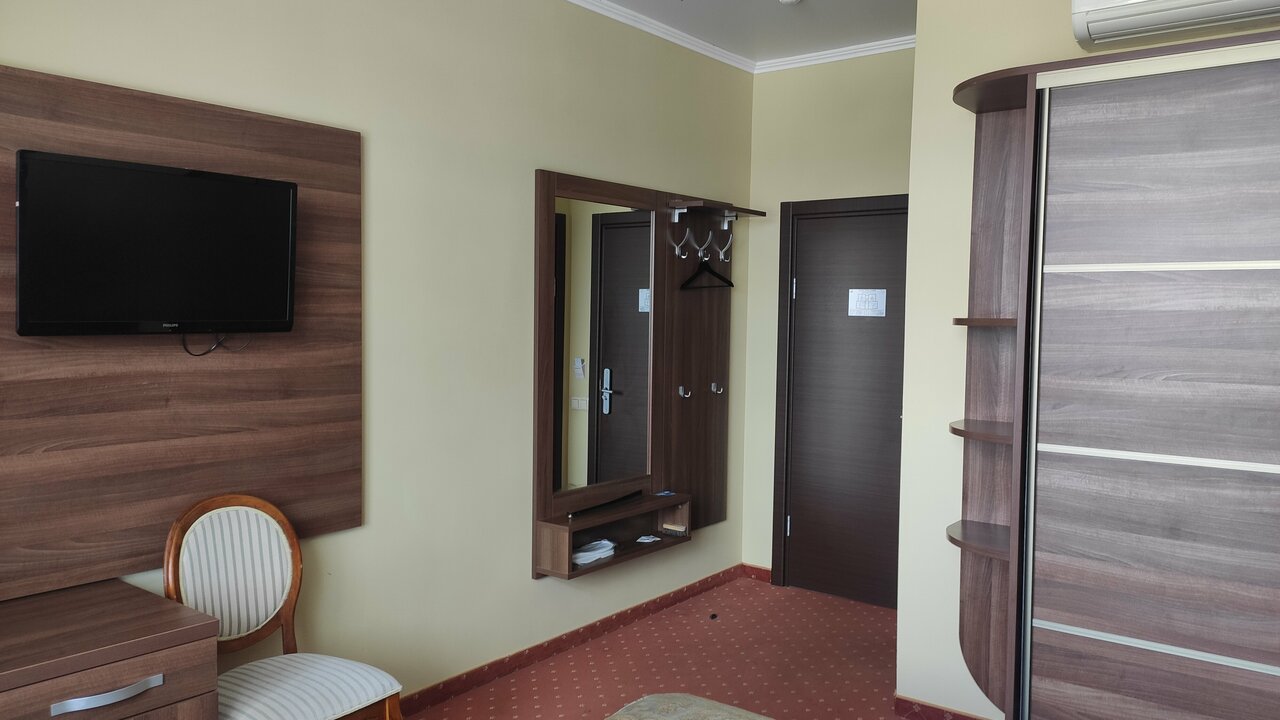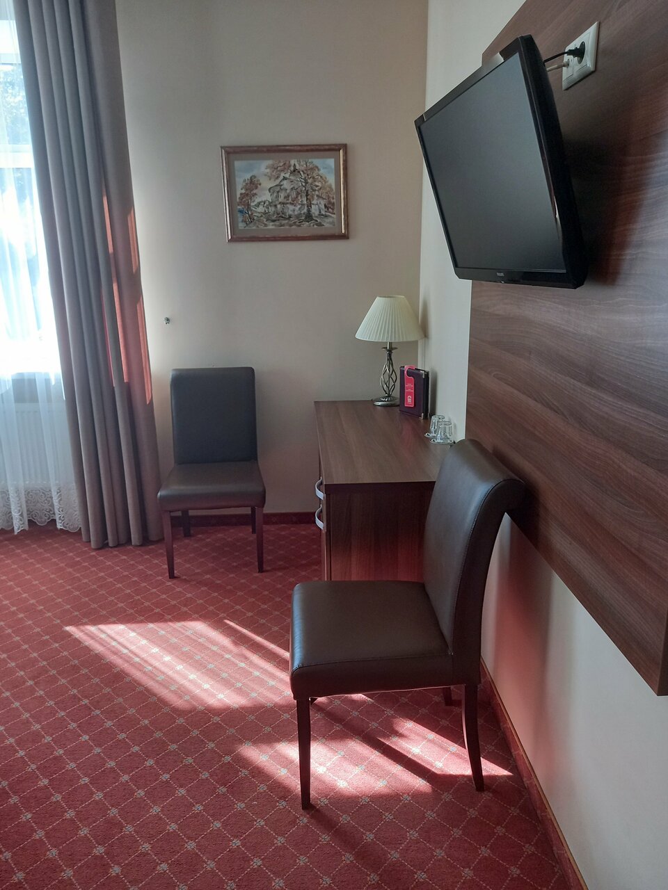 В номере полулюкс нет чайника, не хватает полочек в ванной, мало розеток, несуразно у окна стоит шкаф. В номере полумрак. Телевизор никуда не смотрит. Но очень приличные завтраки и вежливый персонал. Вкусный кофе.