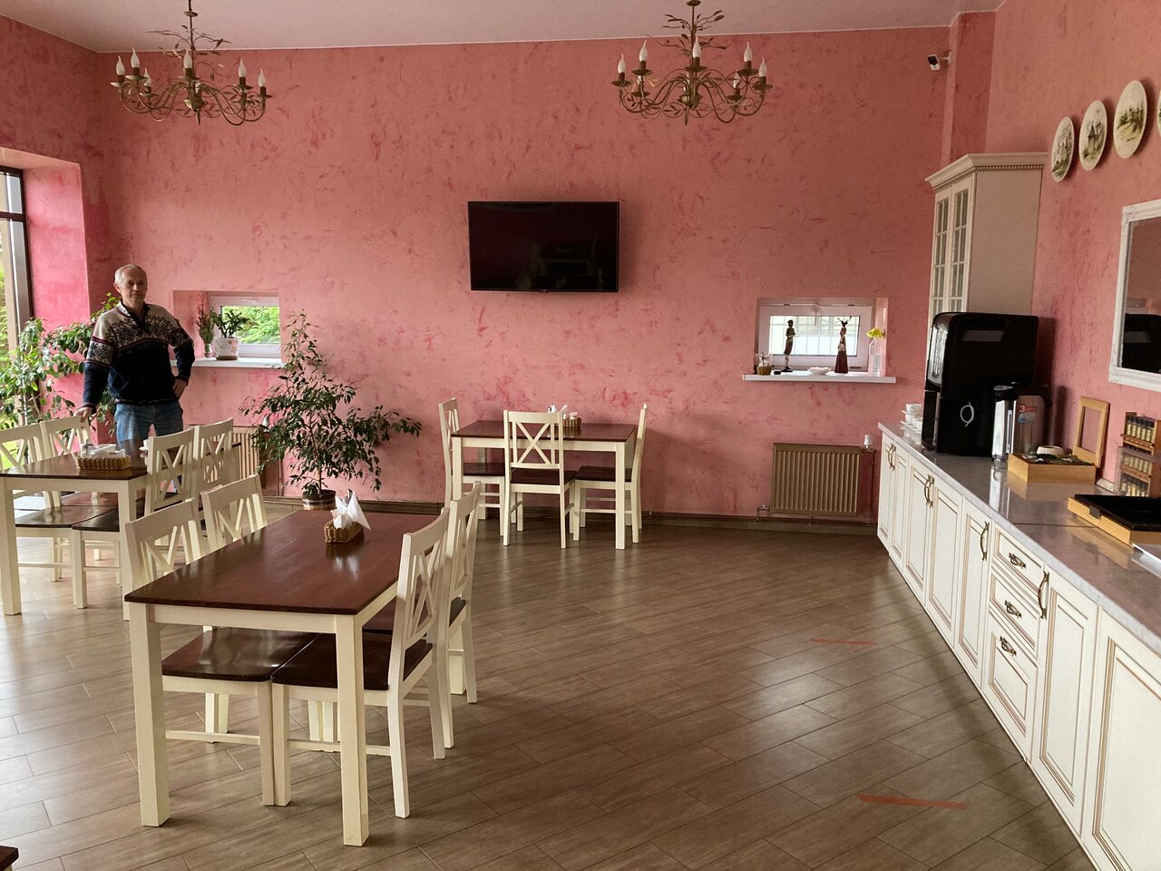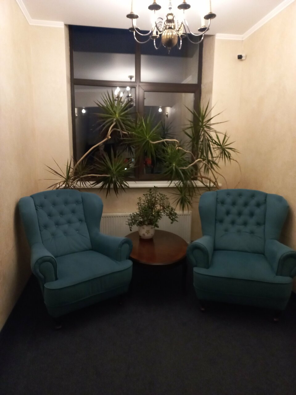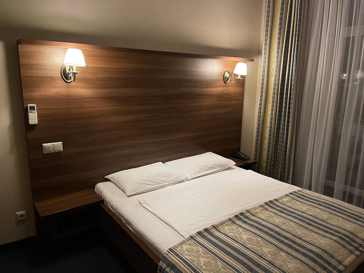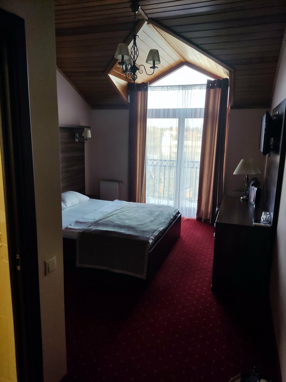 В номере полулюкс нет чайника, не хватает полочек в ванной, мало розеток, несуразно у окна стоит шкаф. В номере полумрак. Телевизор никуда не смотрит. Но очень приличные завтраки и вежливый персонал. Вкусный кофе.