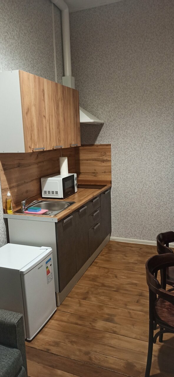 - Полностью оборудованная кухня (посуда, чайник, микроволновка, холодильник).