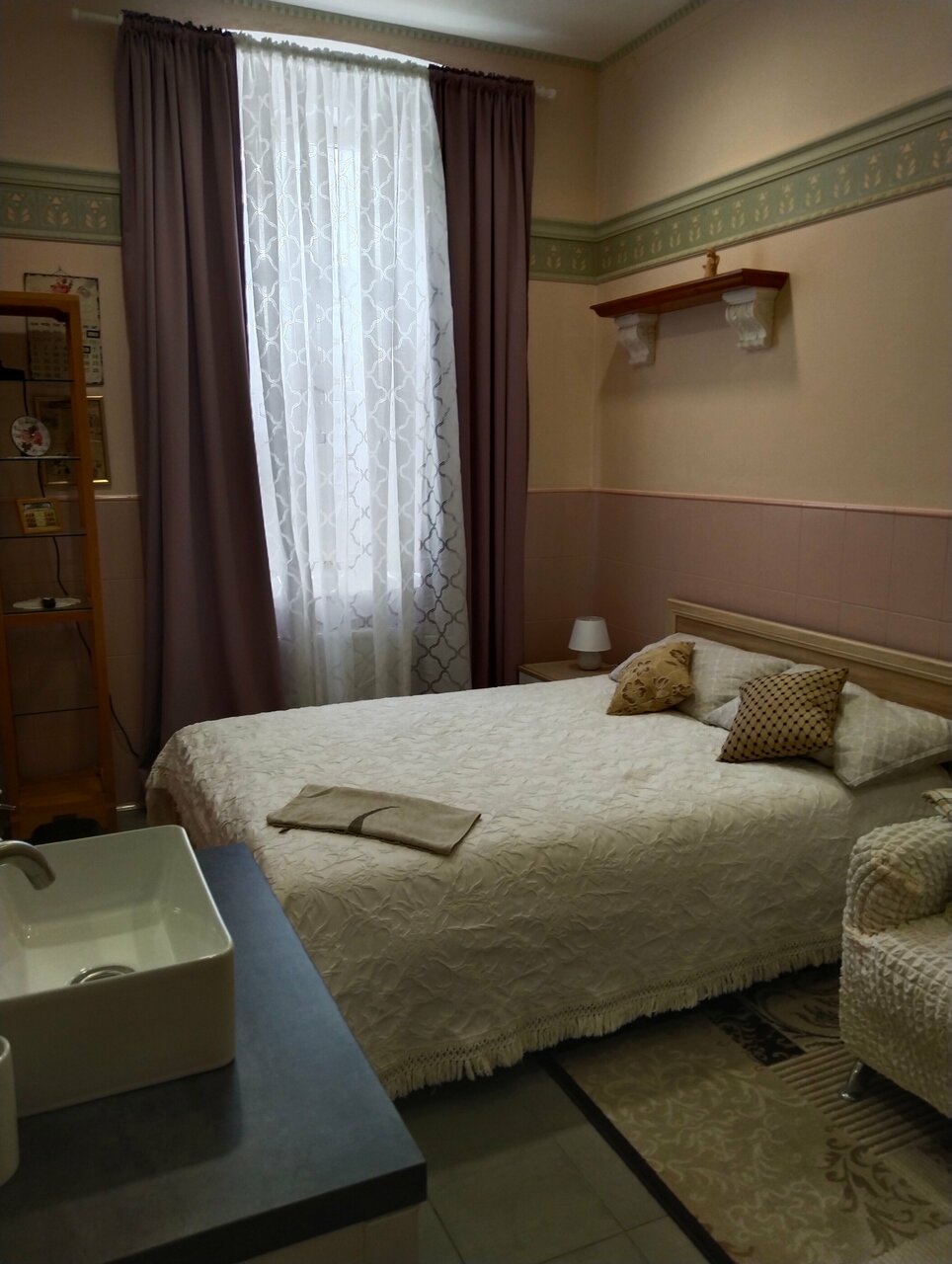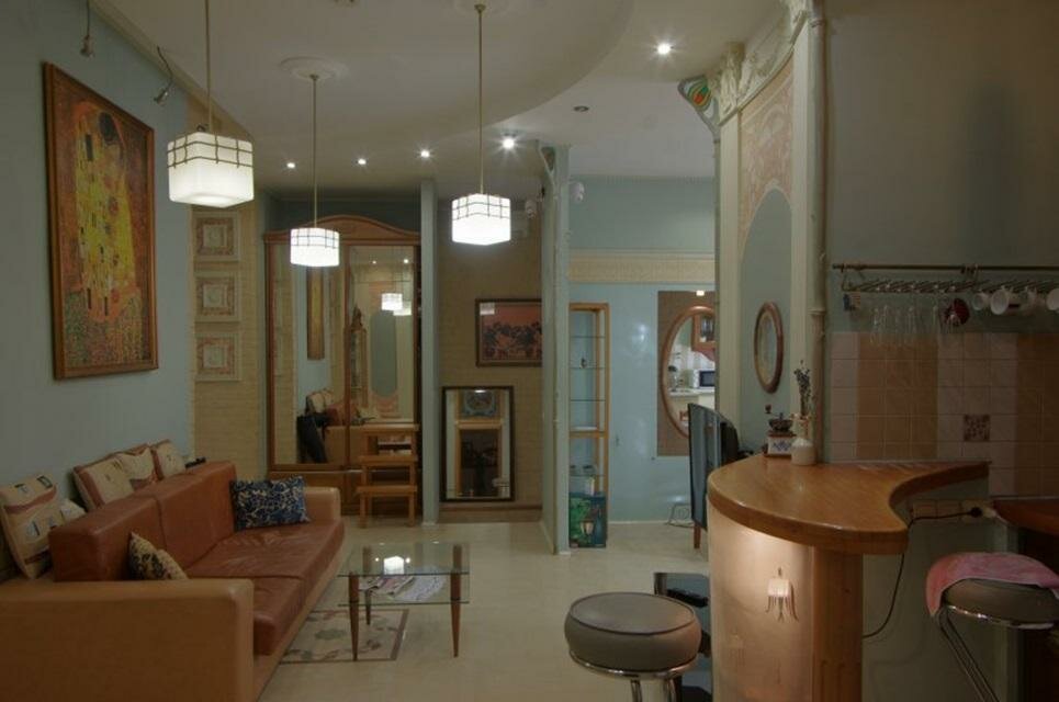 Мини-отель с интересным интерьером. Много милых фишек — необычно открывающийся шкаф, приятные картинки на стенах, витражи, стильные ширмочки в окнах, каждый номер оформлен по своему. Ну и в целом удобно — постели, свежая сантехника, халаты. Недалеко от центра. Очень понимающая, приятная администрация.