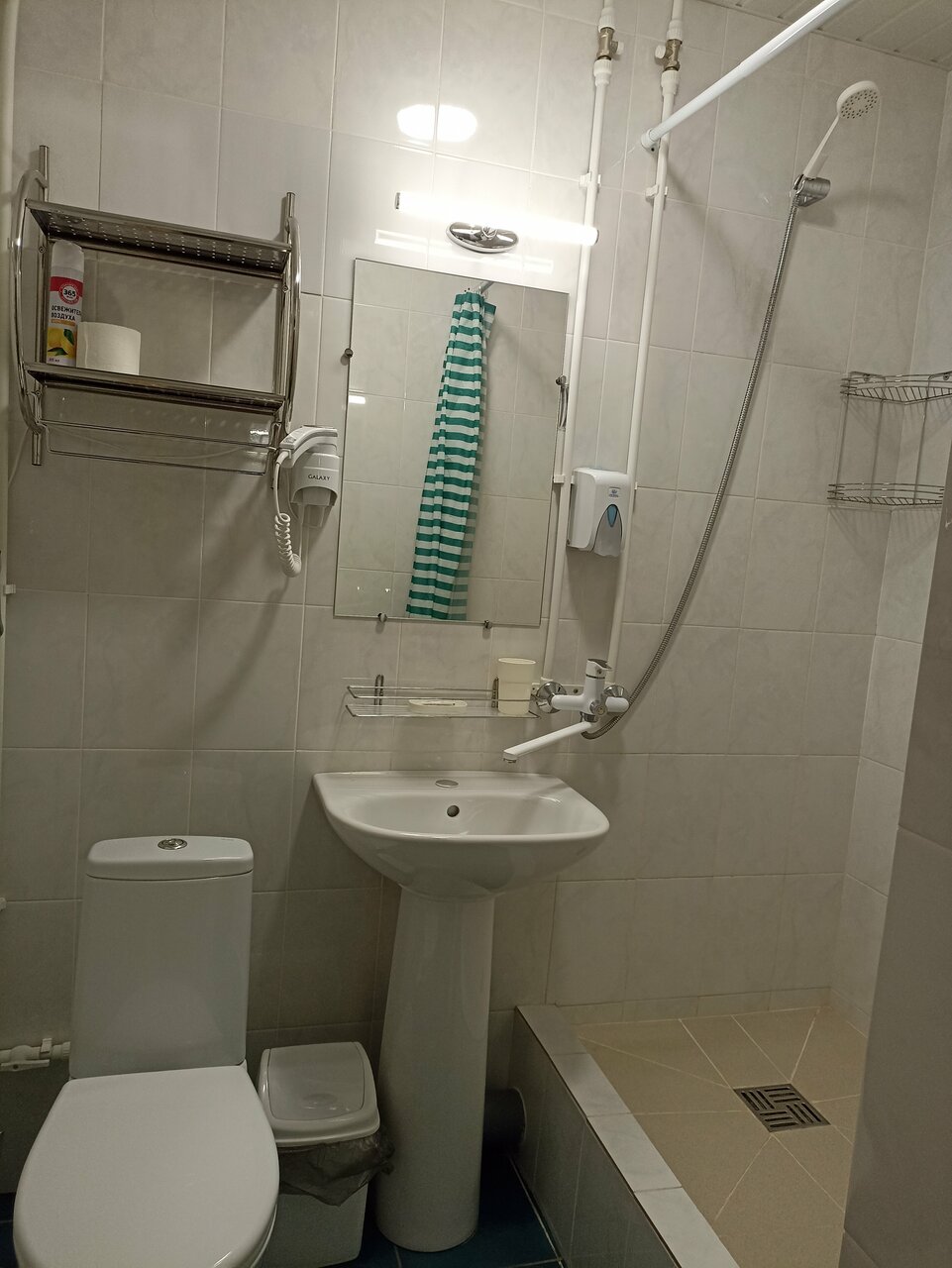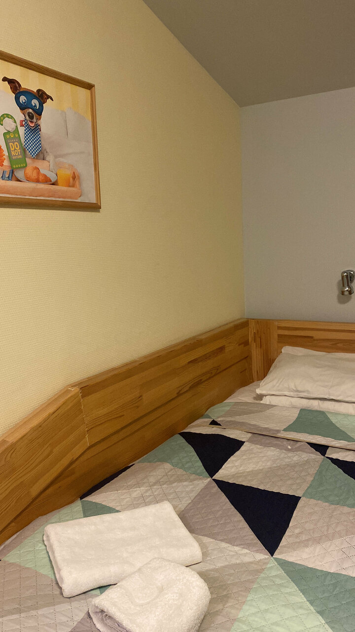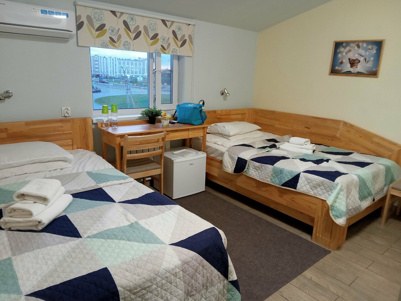 Брали семейный номер. В день заезда нас сильно задержала дорога. Но девушка ждала нас до часу ночи, встретила, все показала и была очень приветлива. В номере две большие кровати, диван и стол- можно и поработать и поиграть с ребёнком. В душе тоже все разместились. До центра подъезжали на машине. А Лента и аптека- совсем рядом. Есть своя маленькая кухня.