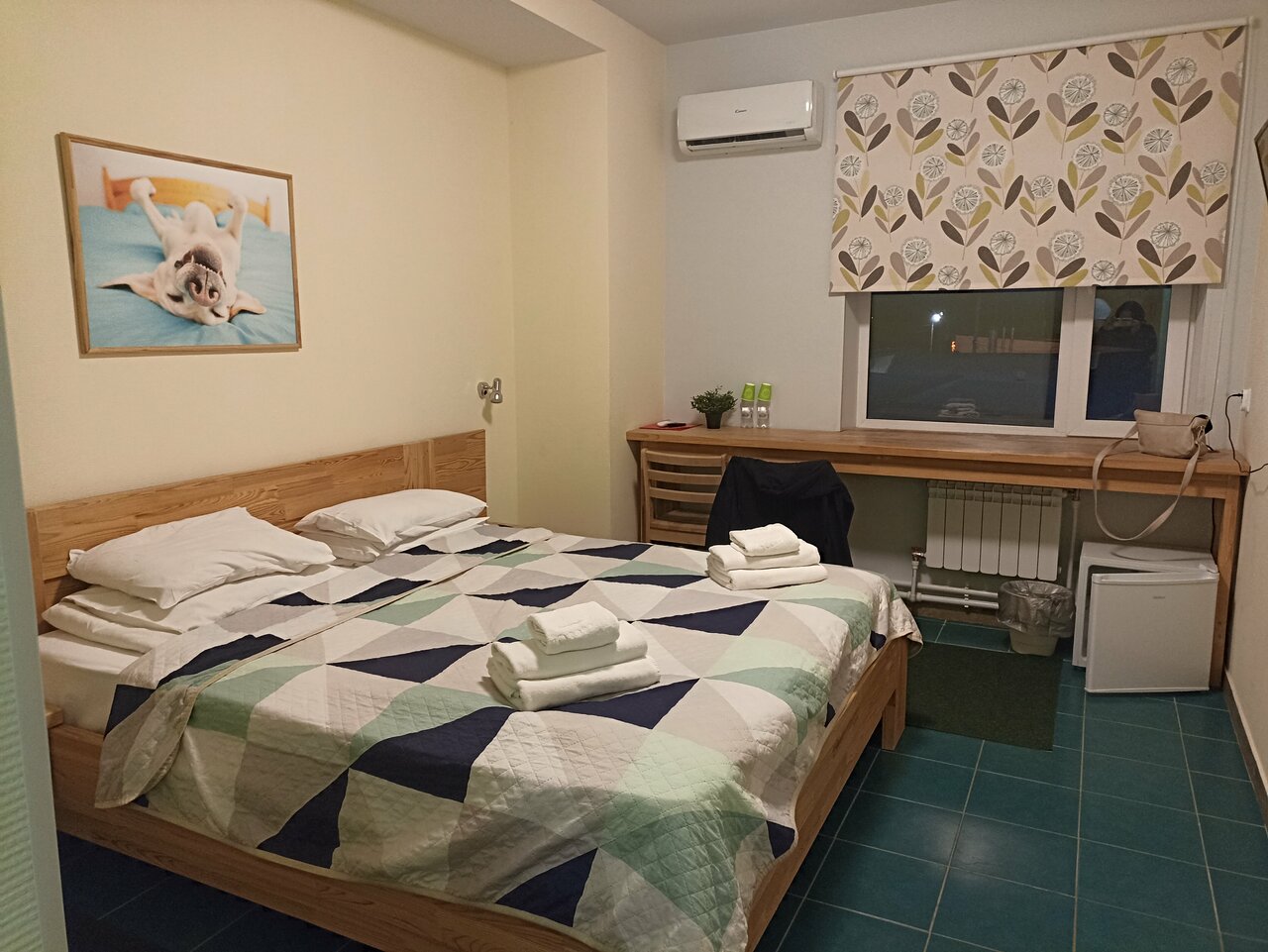 Понравилось доступностью. Когда не было мест нигде, тут были. Очень гостеприимно. Очень недорого. Комната на троих очень большая большая, комфортная, отделка деревом. Такая а-ля загородная гостиница. Все удобства в номере, одна большая двухместная и одноместная кровати, по размеру больше стандартных, большой диван, кресло, журнальный столик, холодильник, стол, миниприхожая. Очень просторно. В номере кондиционер и было очень комфортно в нем находиться, при том, что на улице была жара. Поскольку город маленький, несколько удалённое расположение не является ощутимым минусом. Есть кухня, там можно чтото греть, готовить, хранить, кушать. Небольшой минус — это автомойка и неработающая в выходные трапезная. Но рядом есть гипермаркет и такси стоит очень недорого. Для бюджетного отдыха лучше не найти