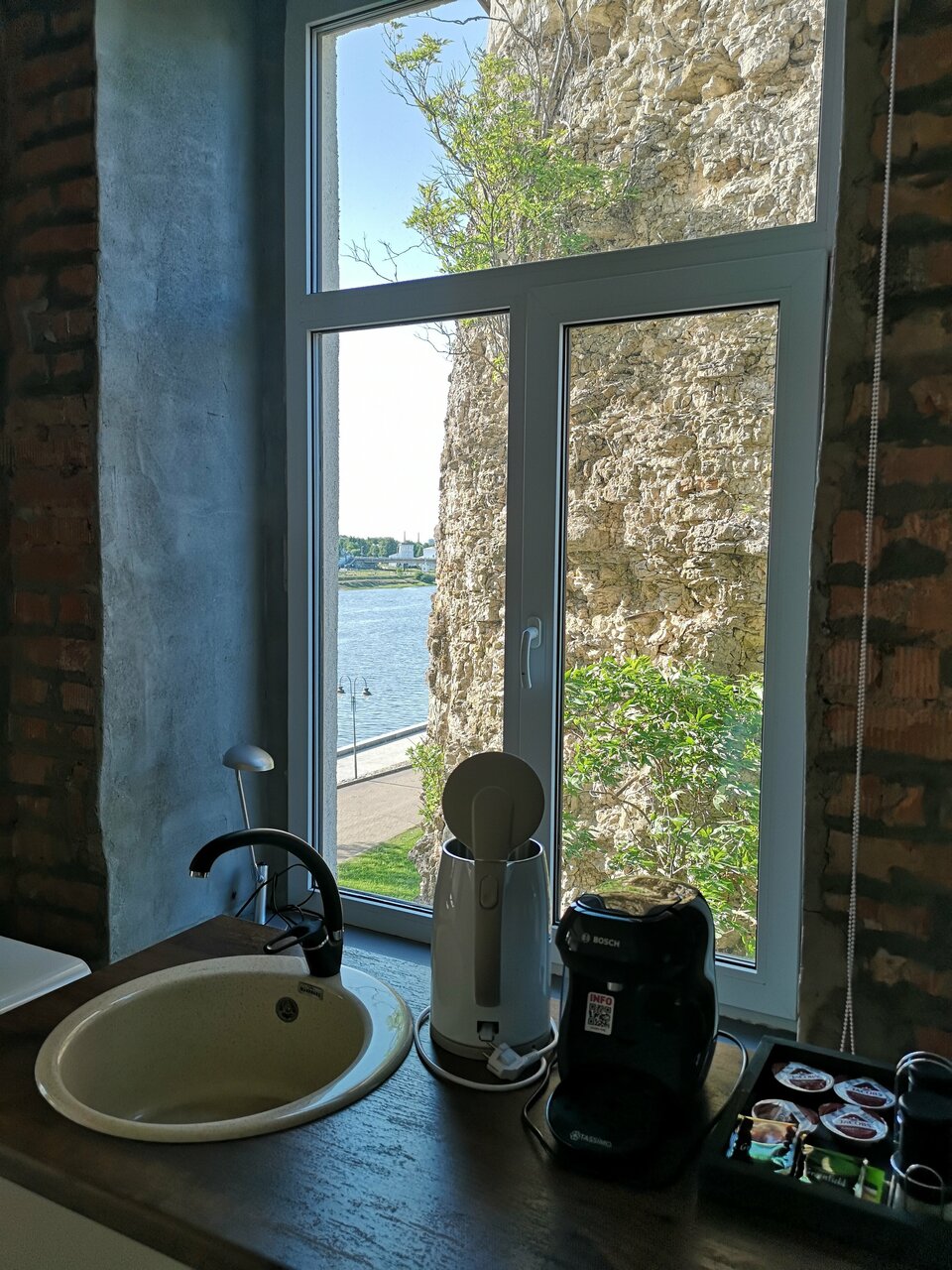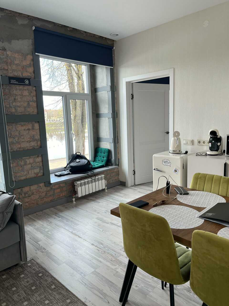 Хорошие апартаменты, уютно, чисто. Въезд с территории огороженного жилого комплекса. Менеджер выдает брелок от автостоянки и карточку для выхода из здания на набережную. В номере холодильник, микроволновка, кофеварка с капсулами, чайник, фен, утюг, гладильная доска. Все удобно. Вид из окна у нас был на Мстиславскую башню и набережную реки — очень атмосферно. Кондиционера нет, но душно не было, хотя на улице была жара. На первом этаже здания бар, первую ночь было нормально, во вторую народ громко гулял. Это как повезёт. Расположение прекрасное, центр города. До Кремля минут 10 пешком. Достопримечательности, рестораны, магазины все в пешей доступности. В ресторан на другой берег реки такси везёт за 150. В следующий приезд остановимся здесь же, скорее всего