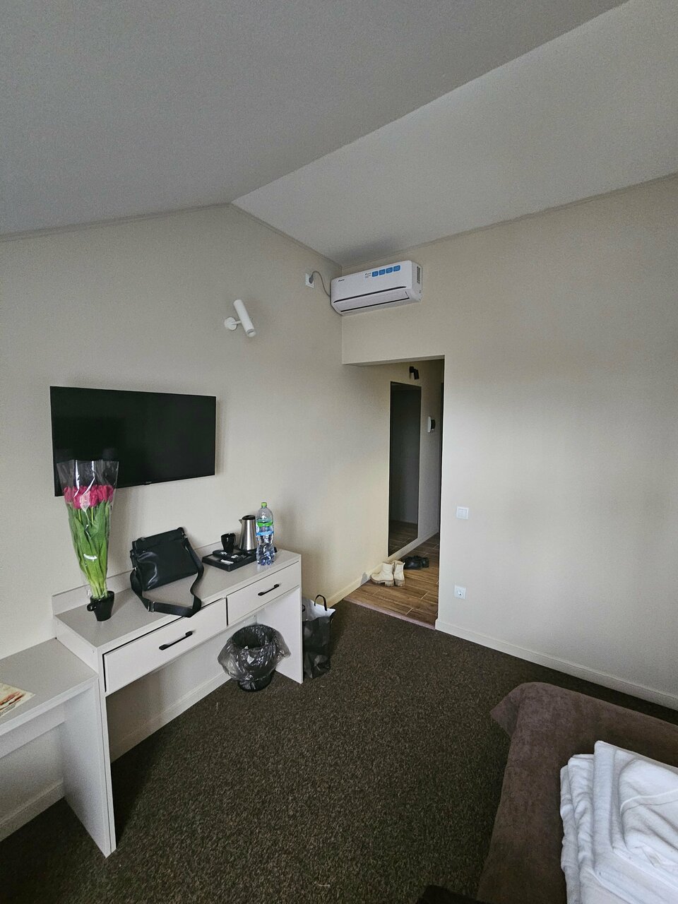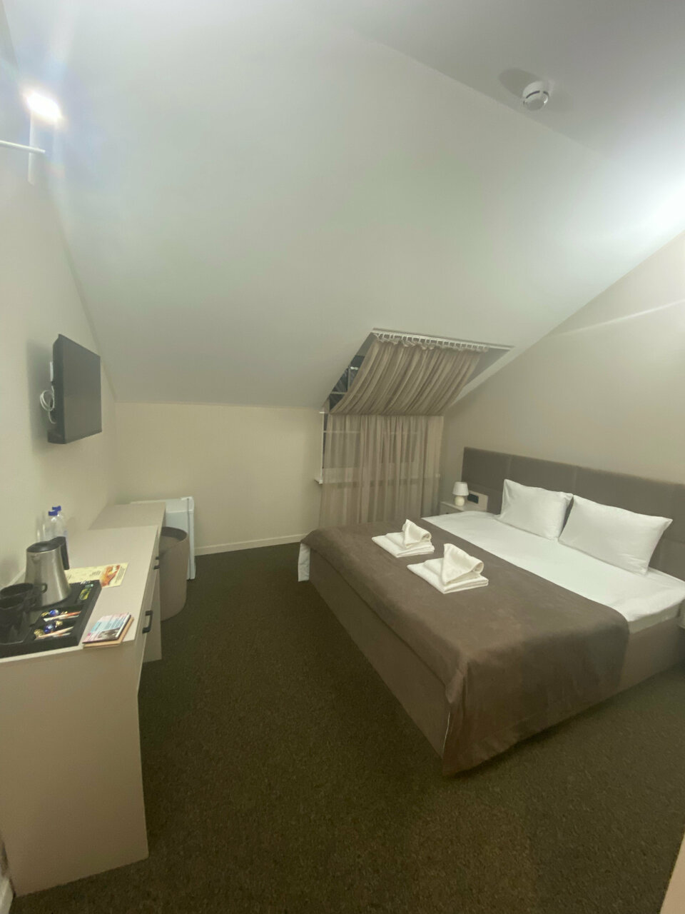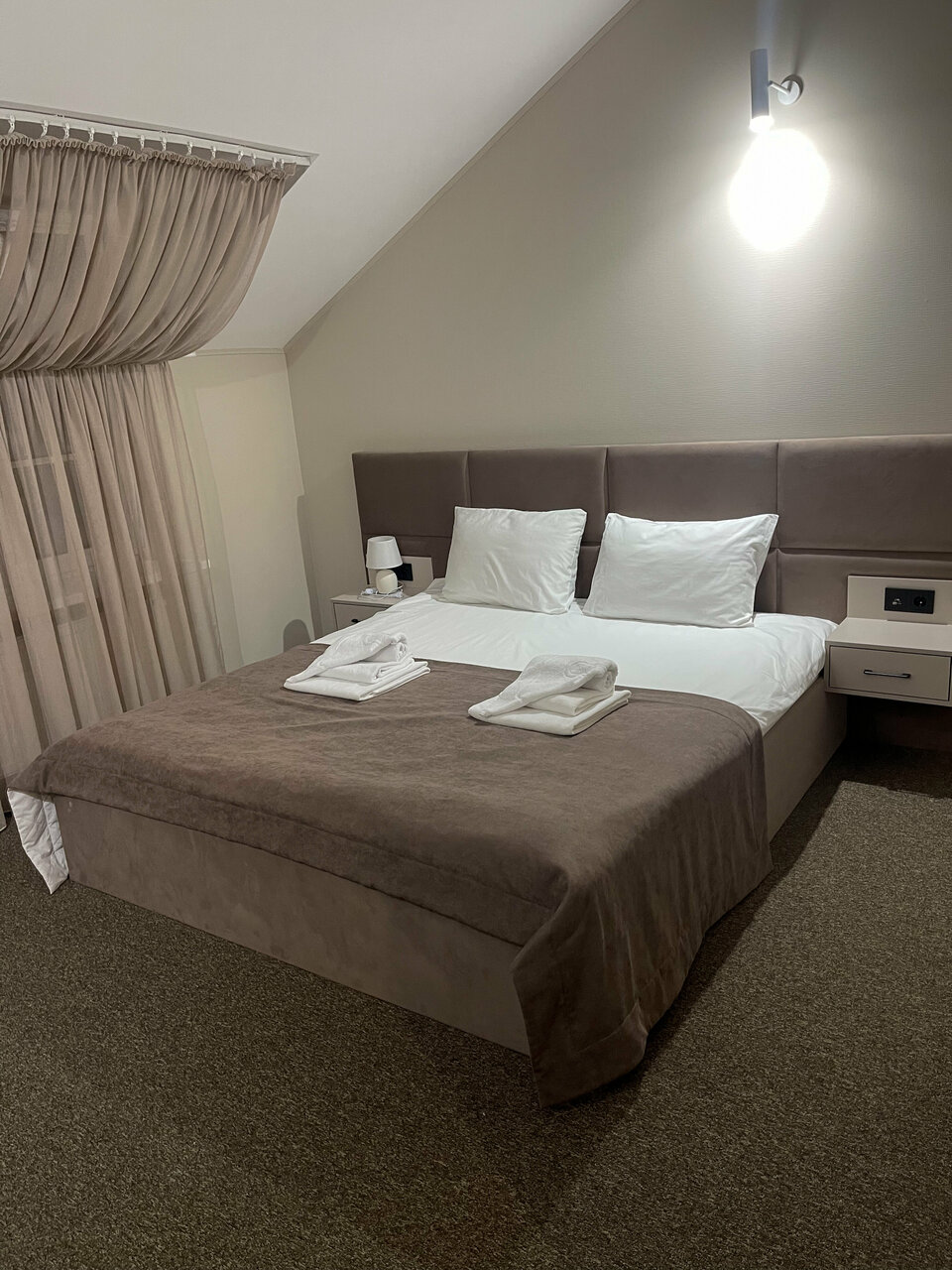 Гостиница шикарная, кровать и постельное белье изумительные. Да, гостиница находится не в центре города, но мы были на машине для нас это не проблема. К тому же в гостинице имеется закрытая стоянка. Свежий ремонт, удобная душевая, вода уходит хорошо и быстро. Халаты мягкие и незамученные. Рядом продуктовый магазин. Полотенца меняли еженедельно, уборку тоже. Нам очень все понравилось, от души персоналу огромное спасибо!