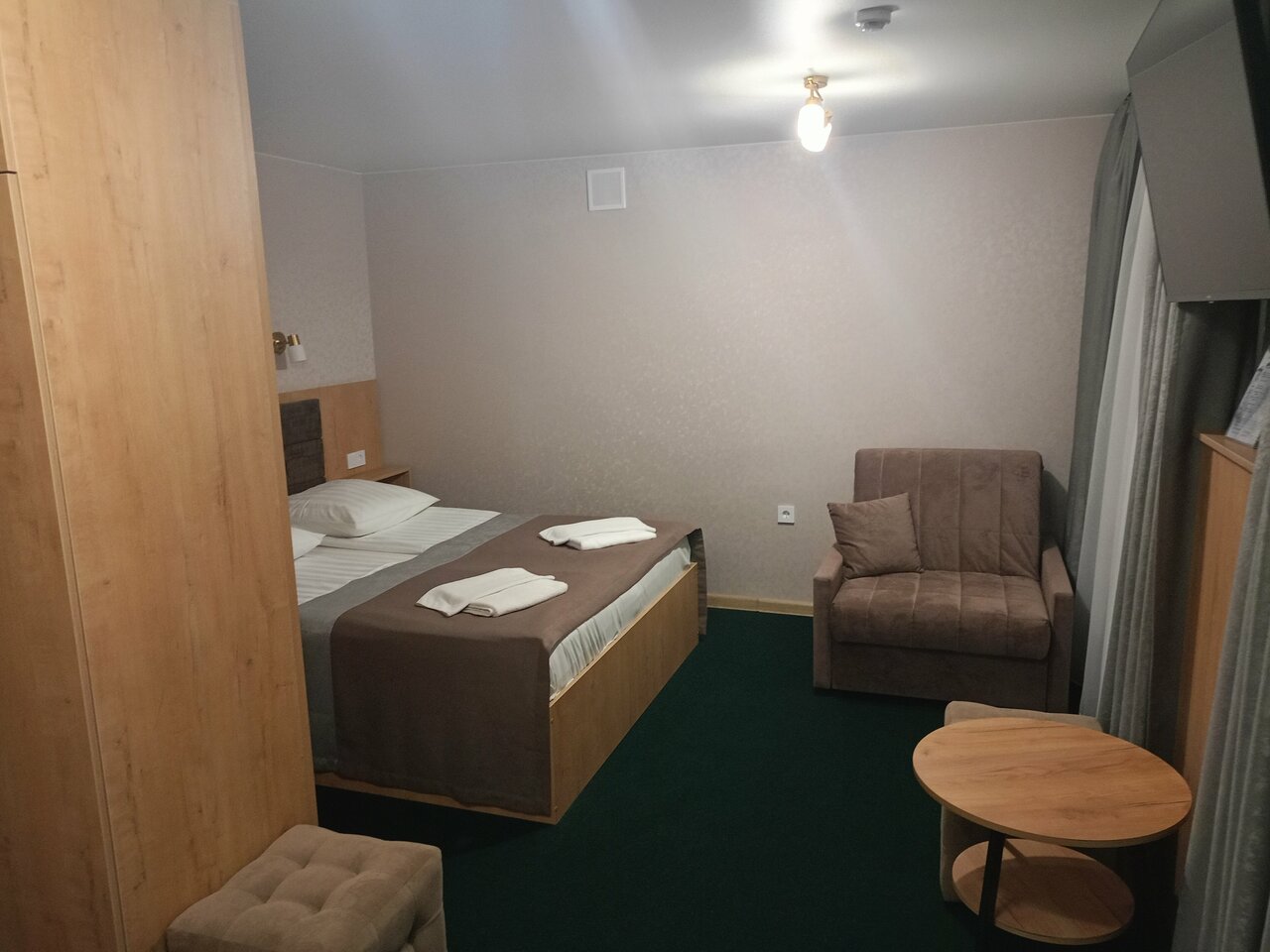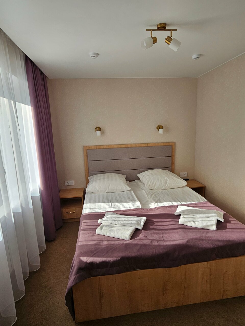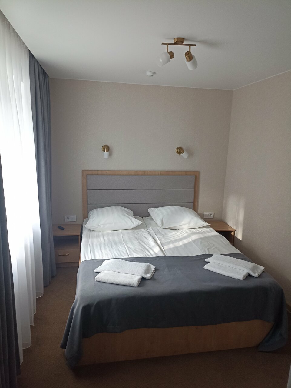 Останавливались в гостинице на одну ночь. 2-х местный номер. Номер полностью укомплектован всем необходимым. Кровать удобная. Тепло. Порадовала даже такая мелочь, как крючки в санузле. Завтрак — шведский стол — вполне достаточный. (Не очень вкусный кофе, но можно заменить его другими напитками). Комфортно отдохнули остались довольны.
