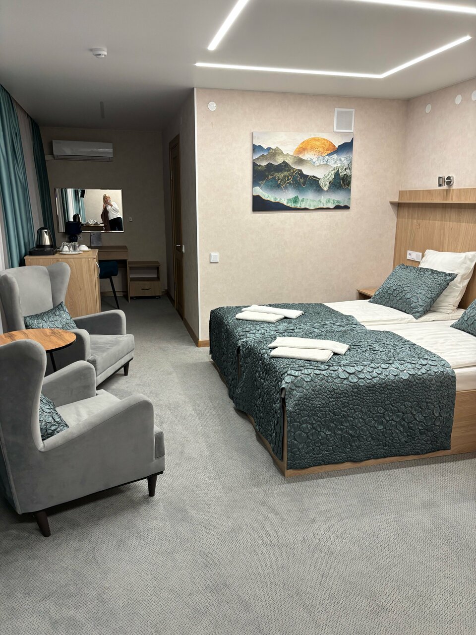 Хороший номер двухкомнатный полулюкс, и две комнаты и кондишен, и тихо, и рядом с рекой, и через мост пароход, очень остались довольны!