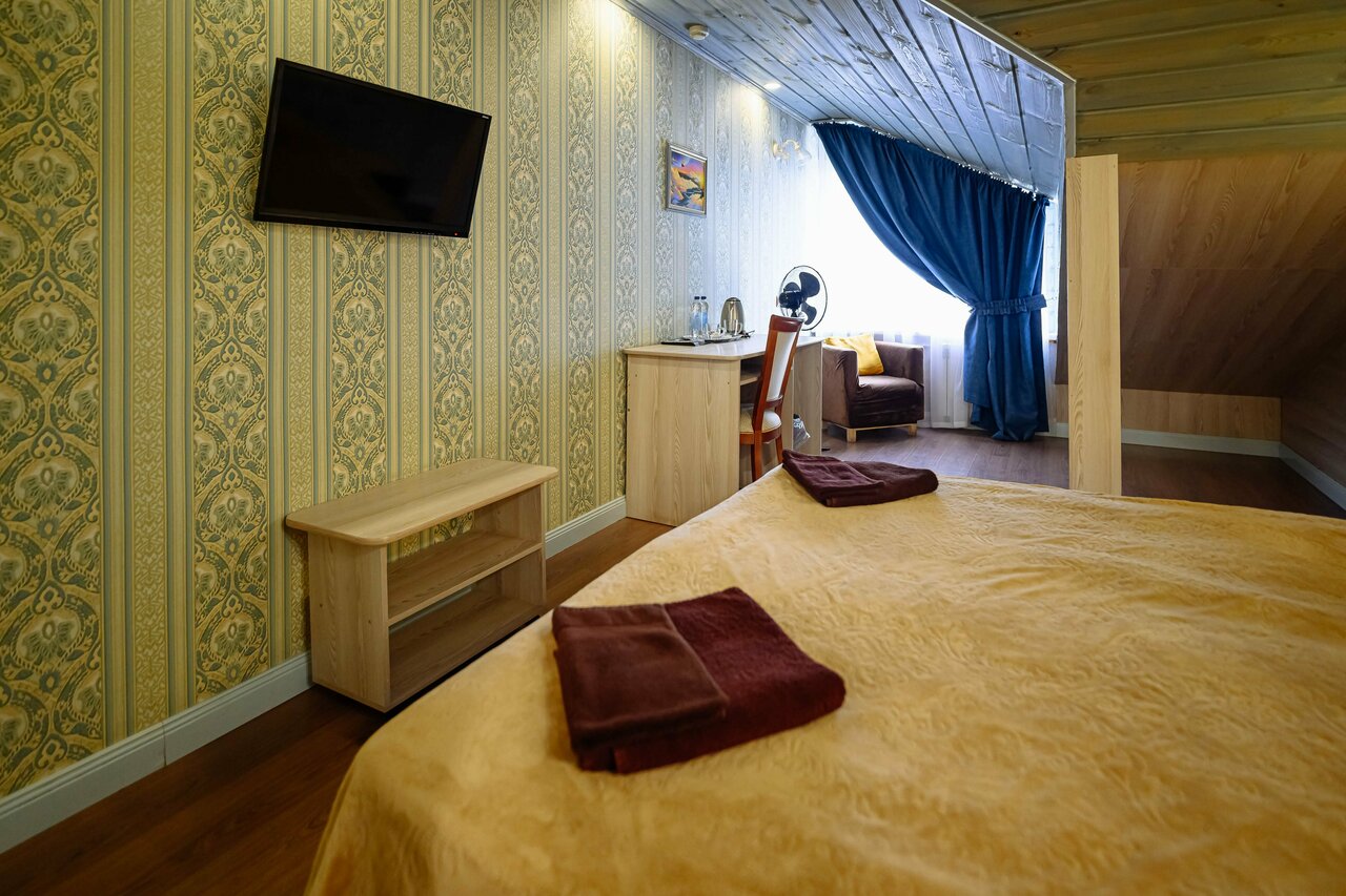 Не удобно только одно — не в пешей доступности от центра. Еда отличная — заказывали фрикассе из курицы с болгарским перцем и грибами и говядину по строгановски. Оч вкусно. Проживали в номере на мансарде. Брали трехместный номер на двоих, других не было. Комфортно, чисто, белье хб/сатин, матрасы удобные, санузел норм (душ/шампунь/ проч), вентилятор, чайник,чай, вода. Рекомендую, несмотря на странное название и дизайн).
