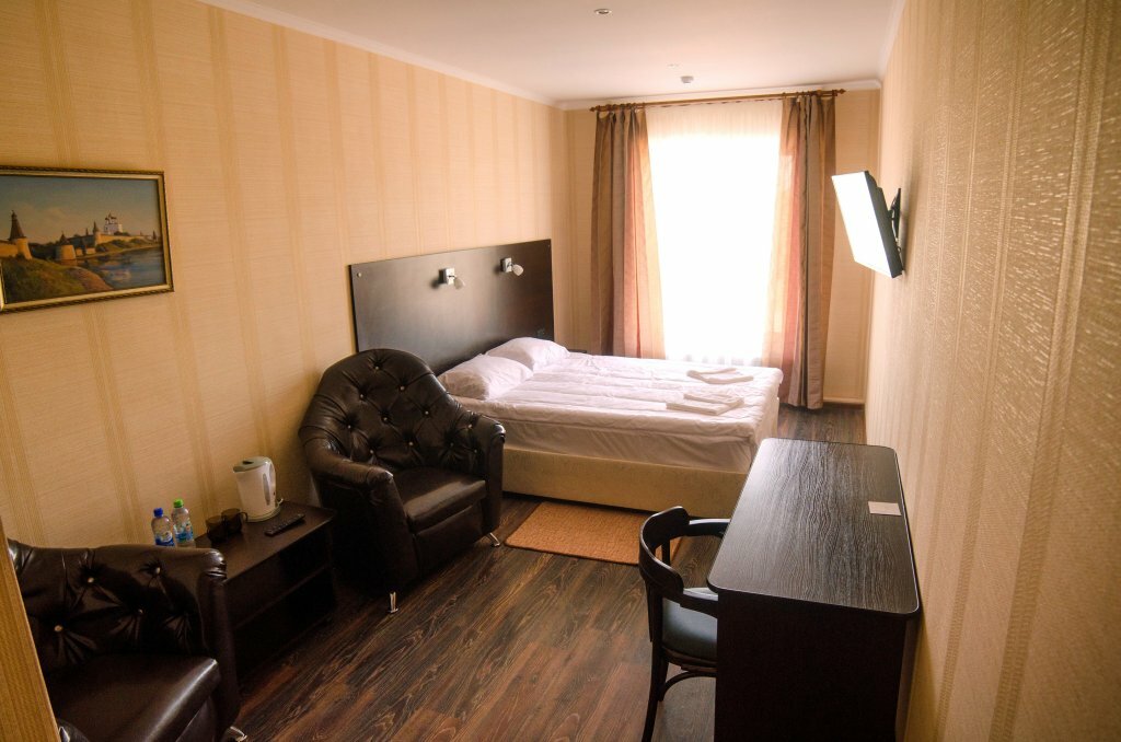 Гостиница меня устроила. Соответствует своим 3*, я бы сказал, что даже немного больше. Завтрак, шведский стол, выбор не очень большой но достаточный для сытно поесть. Уборка в номере каждый день. Если использовал шампунь или гель, или питьевую воду в бутылке, восполняют. Есть одноразовые тапочки. Сам номер норм, кровать удобная, главное что матрас не продавлен. Из минусов мало розеток (в моем номере, двухместный с одной кроватью) их было три и расположены странно. Одна возле тумбочки, одна возле стола и одна возле входа внизу. Либо включаешь чайник либо холодильник, торшер либо зарядку доя телефона. Если буду в Пскове, то остановлюсь опять же в этой гостинице.