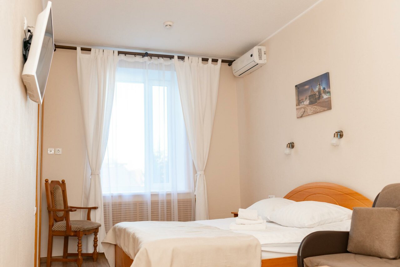 Номер стандарт с двумя отдельными или одной двуспальной кроватью. Санузел в комнате, рядом кухня. Есть возможность организовать 3-е спальное место.