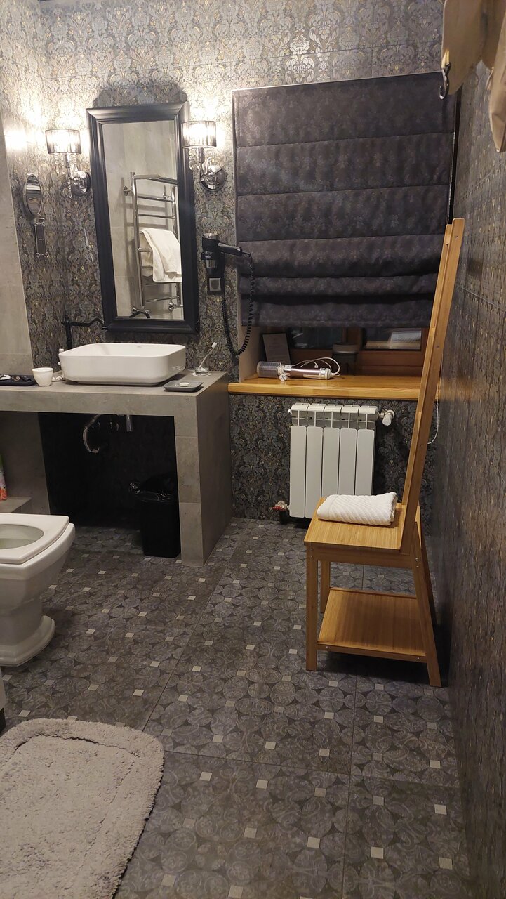 Маленький отель почти в центре города — до кремля 15 минут пешком очень спокойным шагом, до набережной еще меньше. В отеле всего три красивых, достаточно больших номера с прекрасной ванной комнатой. У нас был номер с четырьмя окнами: два выходят на улицу, два на стройку во двор. Стройка нас не беспокоила, поскольку под окнами работы не велись, а ‘нежный’ отдаленный звук болгарки стал слышен после десяти утра. Завтраки вкусные, на выбор из небольшого меню. Администратор не находится в отеле постоянно, но всегда на связи.