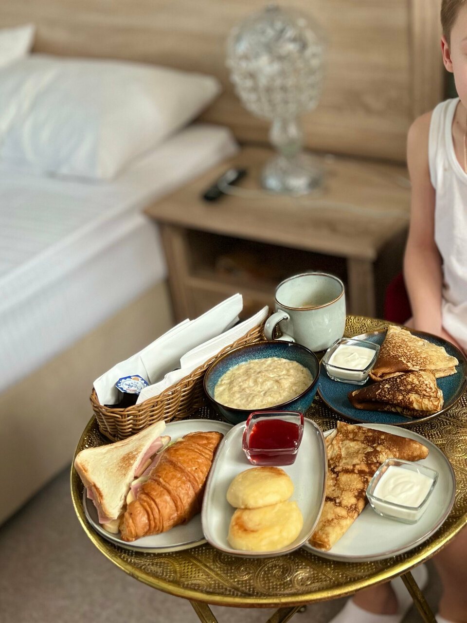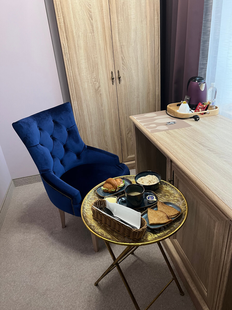 Отель выше всяких похвал! Заселили уже в 11 часов, поскольку номер был готов. Номер очень уютный, всё продумано и гармонично ( даже чайник под цвет занавесок). На полу тёплый ковер. В номере всё необходимое: халаты, тапочки, зубные щётки, мыло, шампунь и даже бритва! Также в номере чай, кофе, сахар, вода, печенье. Завтрак принесли прямо в номер, очень вкусный и сытный. Персонал доброжелательный! Спасибо за чудесный отдых!