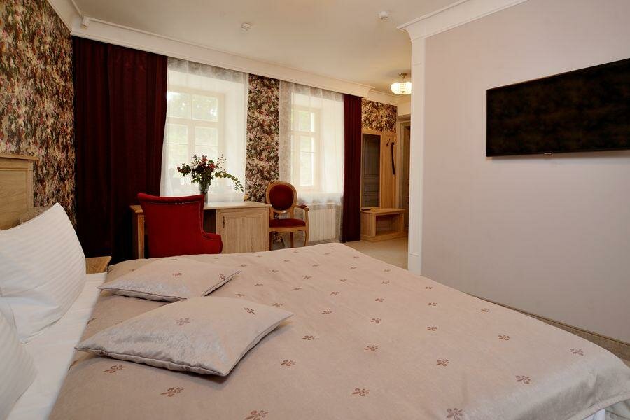 Номер с письменным столом и сейфом оборудован кондиционером и телевизором. К услугам гостей ванная комната с душем и окном. Предоставляются полотенца и постельное белье. До деревни Изборск 31 км, до города Печоры — 43, до аэропорта Псков — 4,2 км