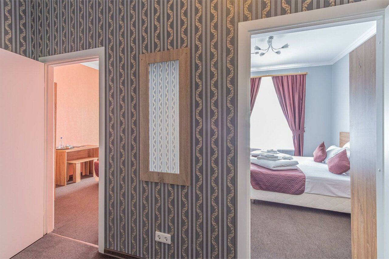 Чистый и уютный номер, две комнаты, отличное расположение отеля,можно взять зонтик на ресепшене,завтраки вкусные, есть кафе на первом этаже, из минусов: нет порожка для душа в ванной комнате, вся вода стекает по полу, очень дует из окон