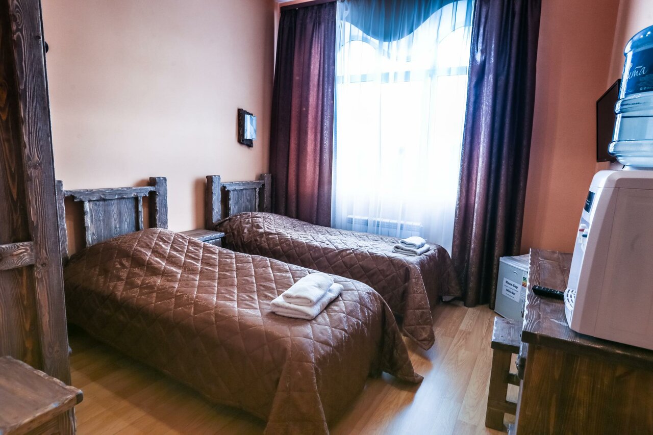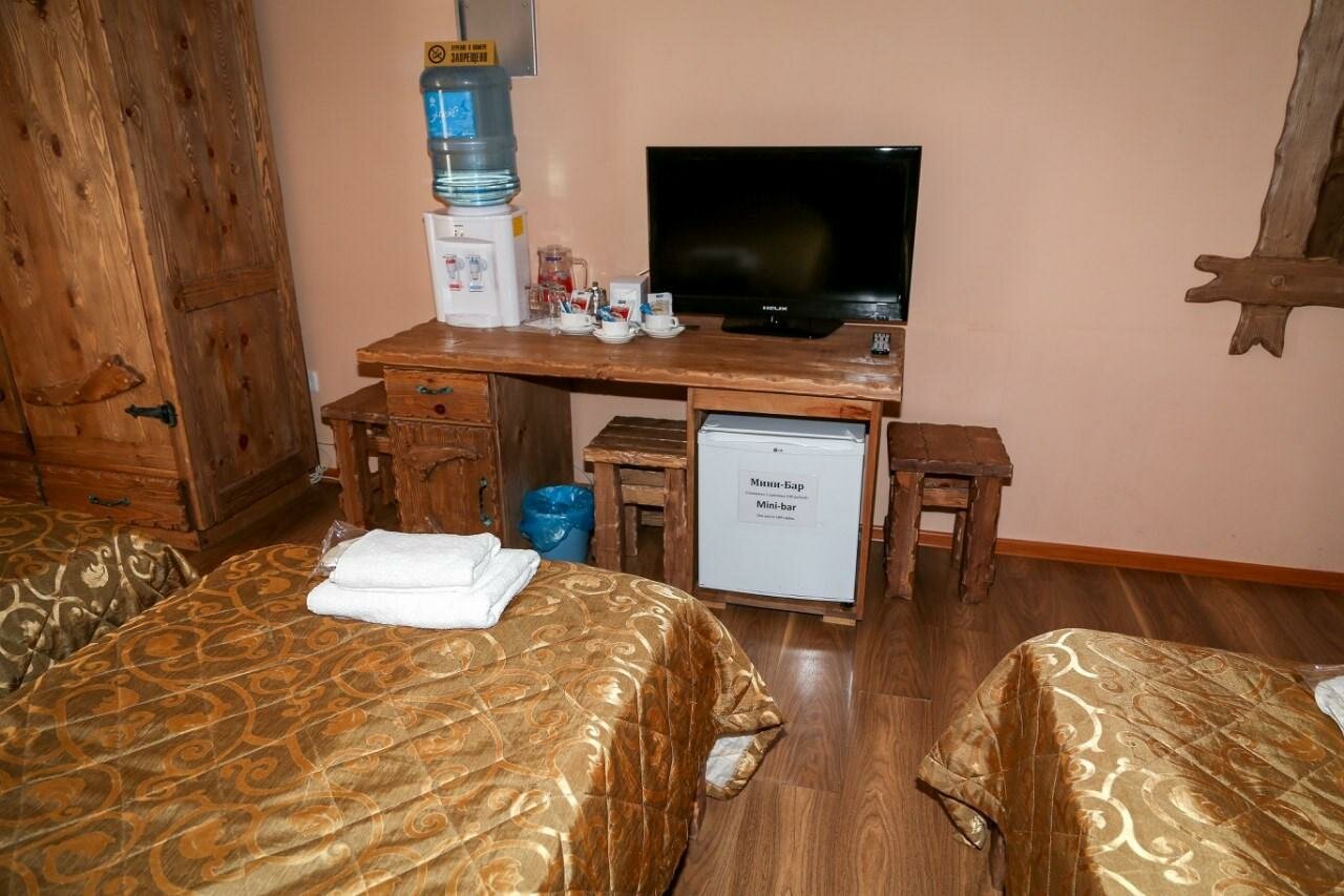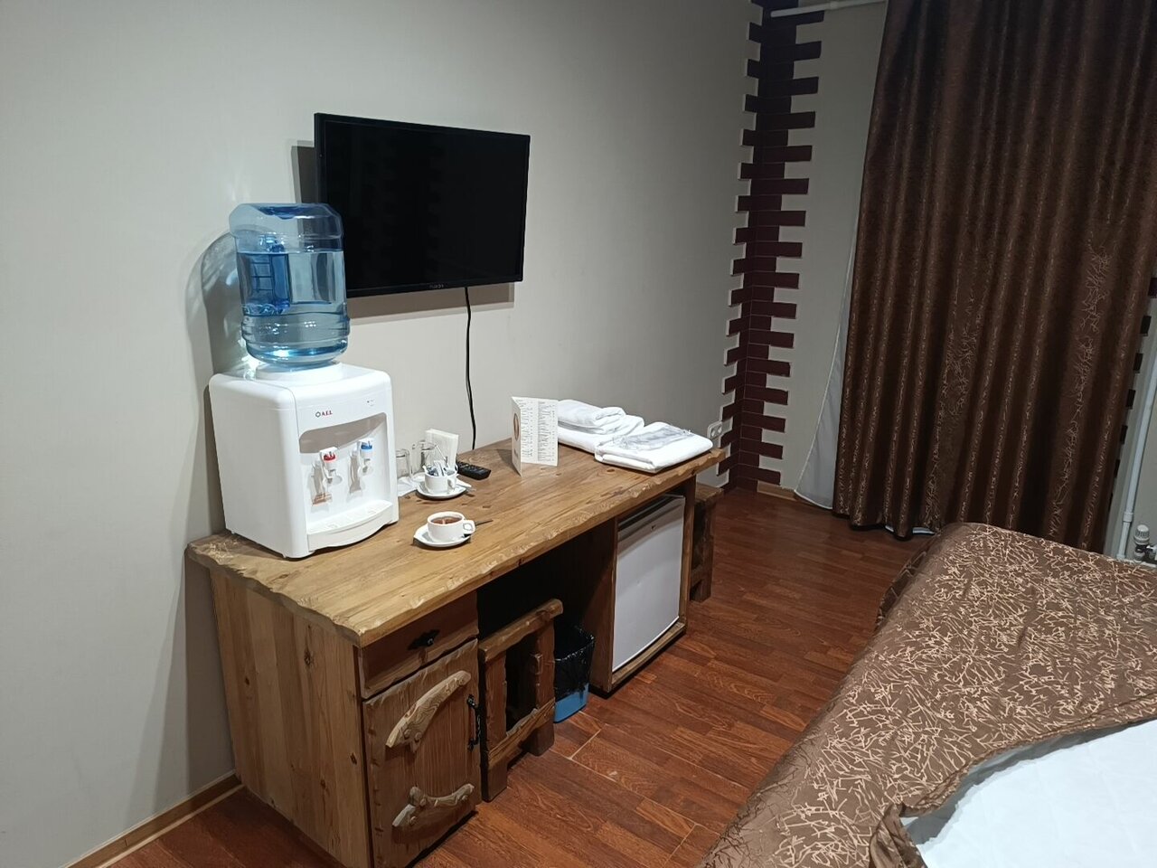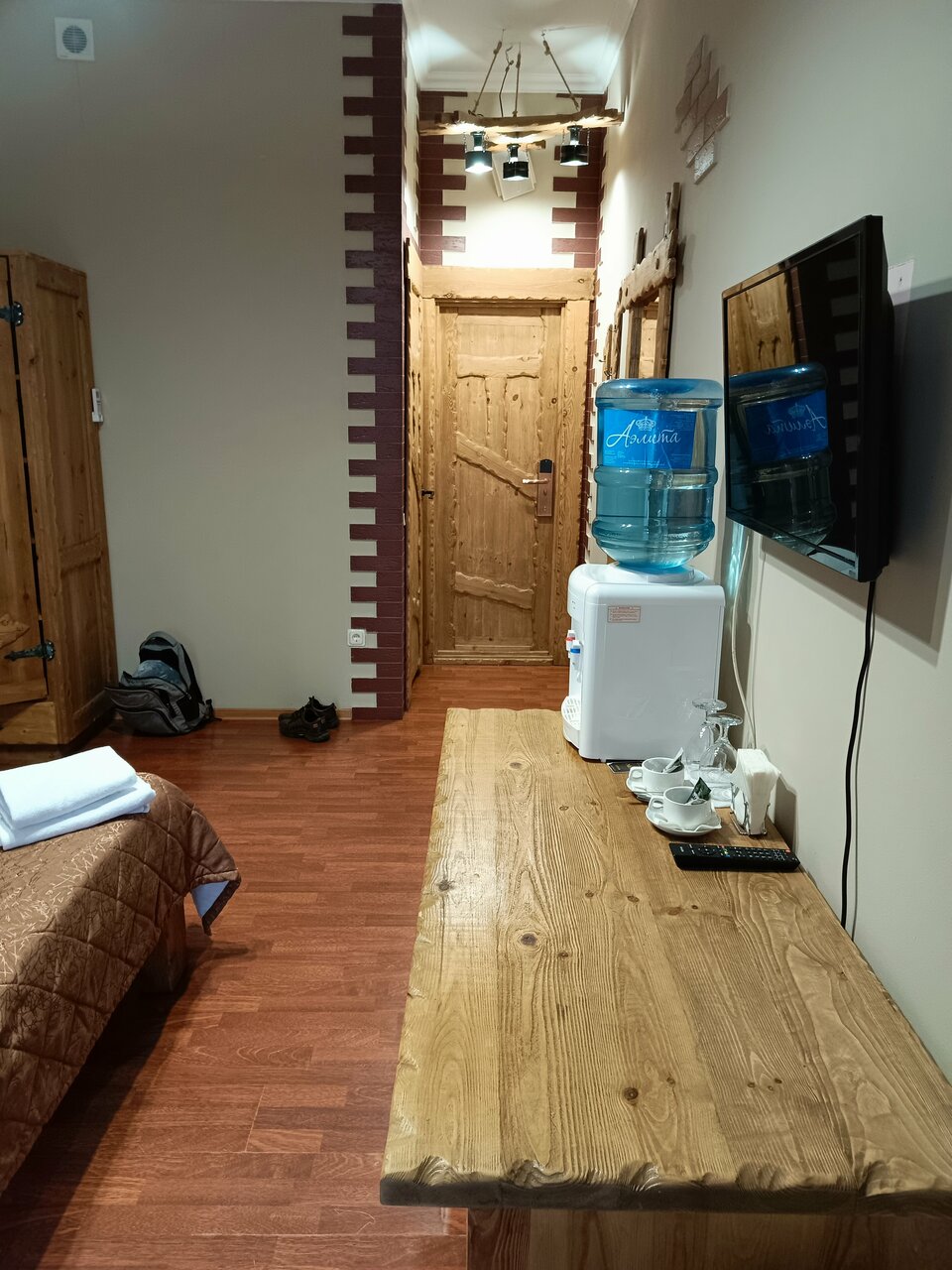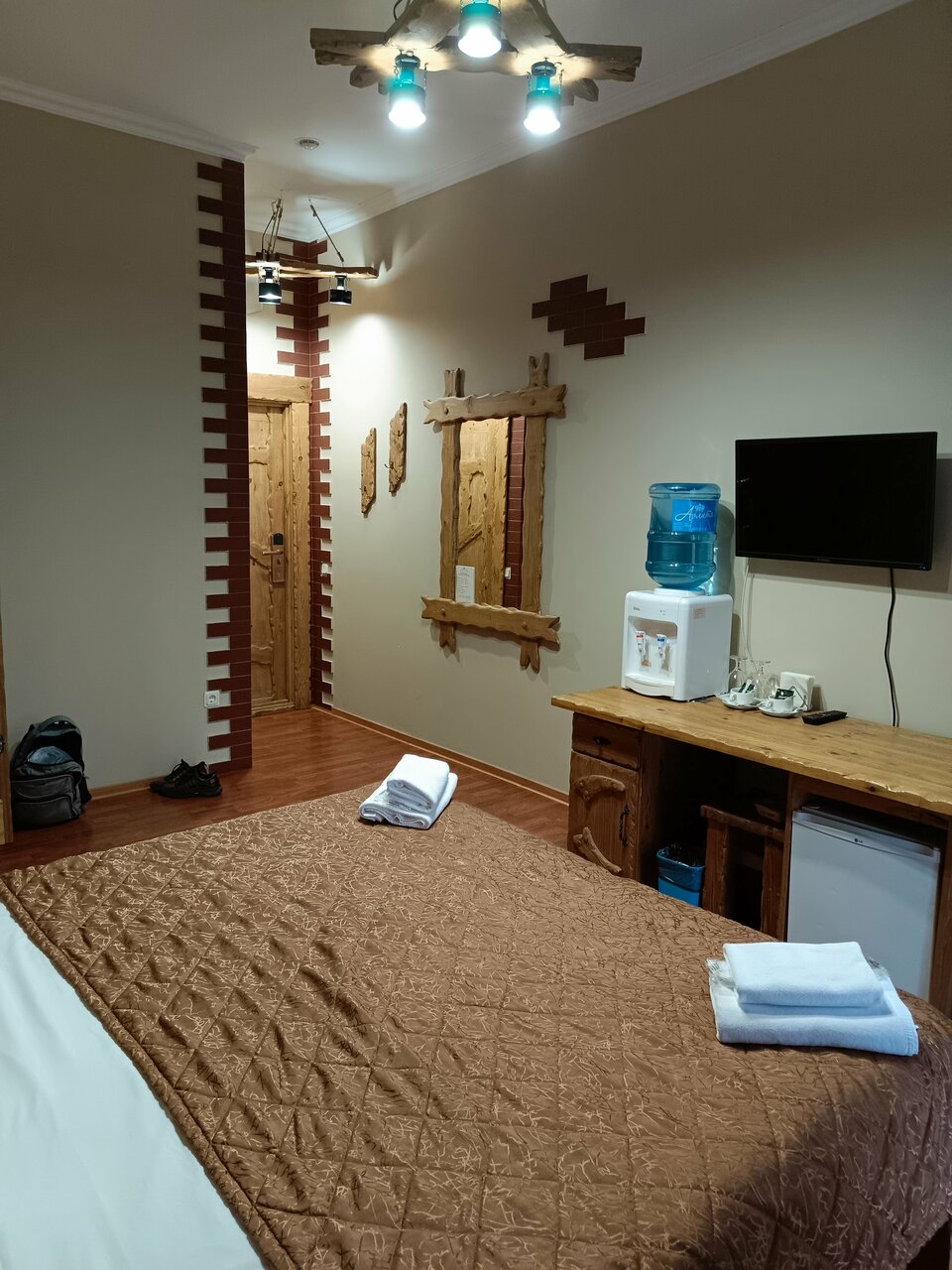 Хорошая гостиница. Персонал приветливый. Жили в 36 номере, кровать двухспальная огромная, белье белоснежное. Хорошая, просторная ванная комната, с горячей водой и хорошим напором в душе. Очень спасал кондиционер в номере от жары и духоты. Так же порадовал кулер в номере, очень удобно, мы ехали из далека с термосами, удобно было в обратную дорогу заварить чай с собой. Холодильник маленький в номере, но очень хорошо морозил. Огромный плюс номера, что не слышно соседей, это частая проблема в гостиницах. Уборка номера была каждый день. В номере есть посуда на две персоны и чай с сахаром. Ещё бы микроволновку на этаже поставить и вообще красота была бы.