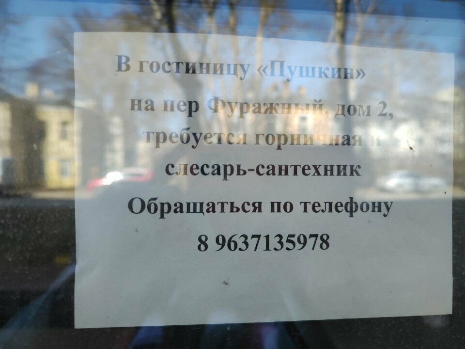 Гостиница «Пушкин» расположена в одноименном городе по адресу: Фуражный переулок, 2. Работает круглосуточно без выходных.
