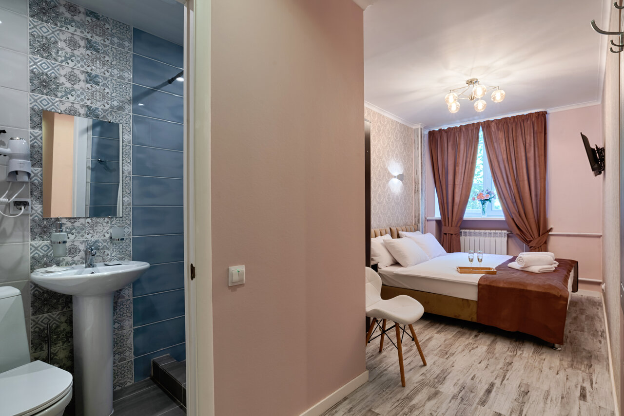 Хороший ремонт, но омрачило проживание общее окно с другим номером, через которое слышно даже не громкую речь, а если закрыть окно то воздух не поступает вообще и дышать нечем. Когда приехали заселяться 40 минут прождали пока уберут наш номер, так как уборщицу не предупредили! ( Хотя мы звонили за 2 часа) полотенцесушитель был сломан в номере, вода в душе не уходила и протекла в спальню по плинтусам. Если ваш ОБ больше 100см, то вы просто физически не сможете пройти в номере к кровати и развернуться в ванной, я не утрирую. Местоположение хорошее. Есть общая кухня с микроволновкой и посудой.