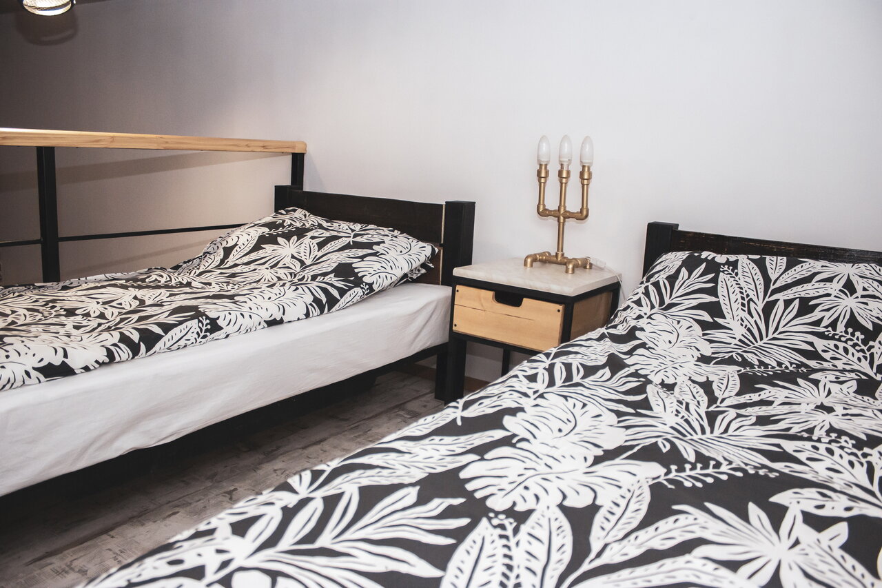 Апартаменты с мини-кухней и собственным с/у. Стиль лофт: метал, сварка, кирпич, дерево. Спальная зона находится на втором уровне, гостиная, мини-кухня и санузел с душем и туалетом - на первом. В коридоре есть холодильник, стир.машина, СВЧ печь.