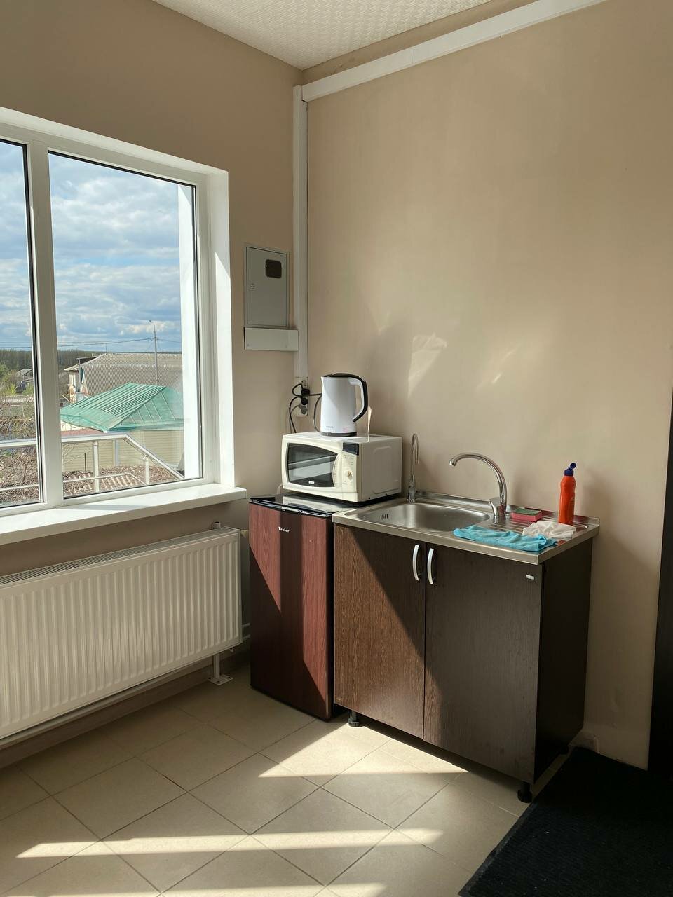 - Наличие кухонной зоны (микроволновка, чайник, холодильник, посуда, плитка).