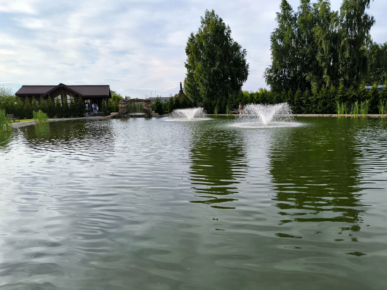 - Пруд с фонтанами и осетром.