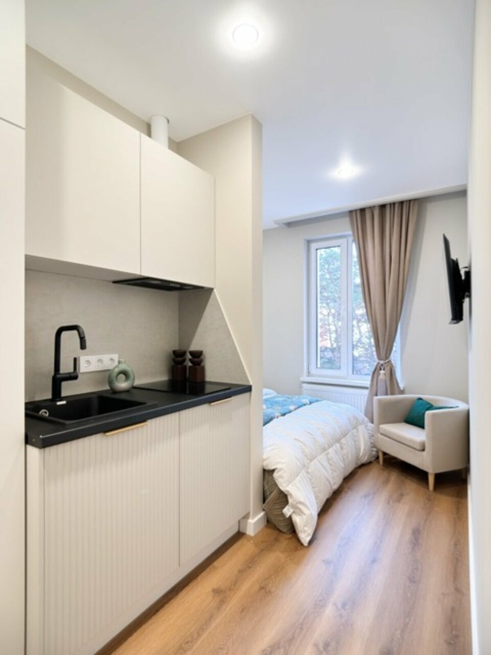 Апартаменты соответствует фото, заселились оперативно.Всё необходимое для проживания есть, полотенце, постельное бельё,всё чистое, хорошо выглаженное.