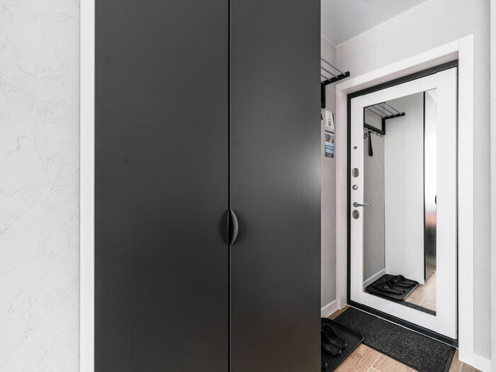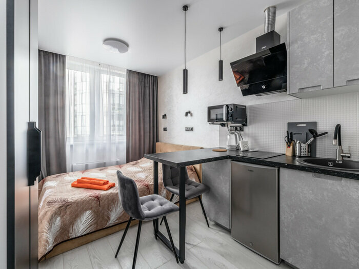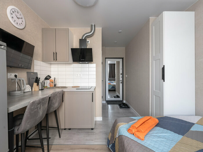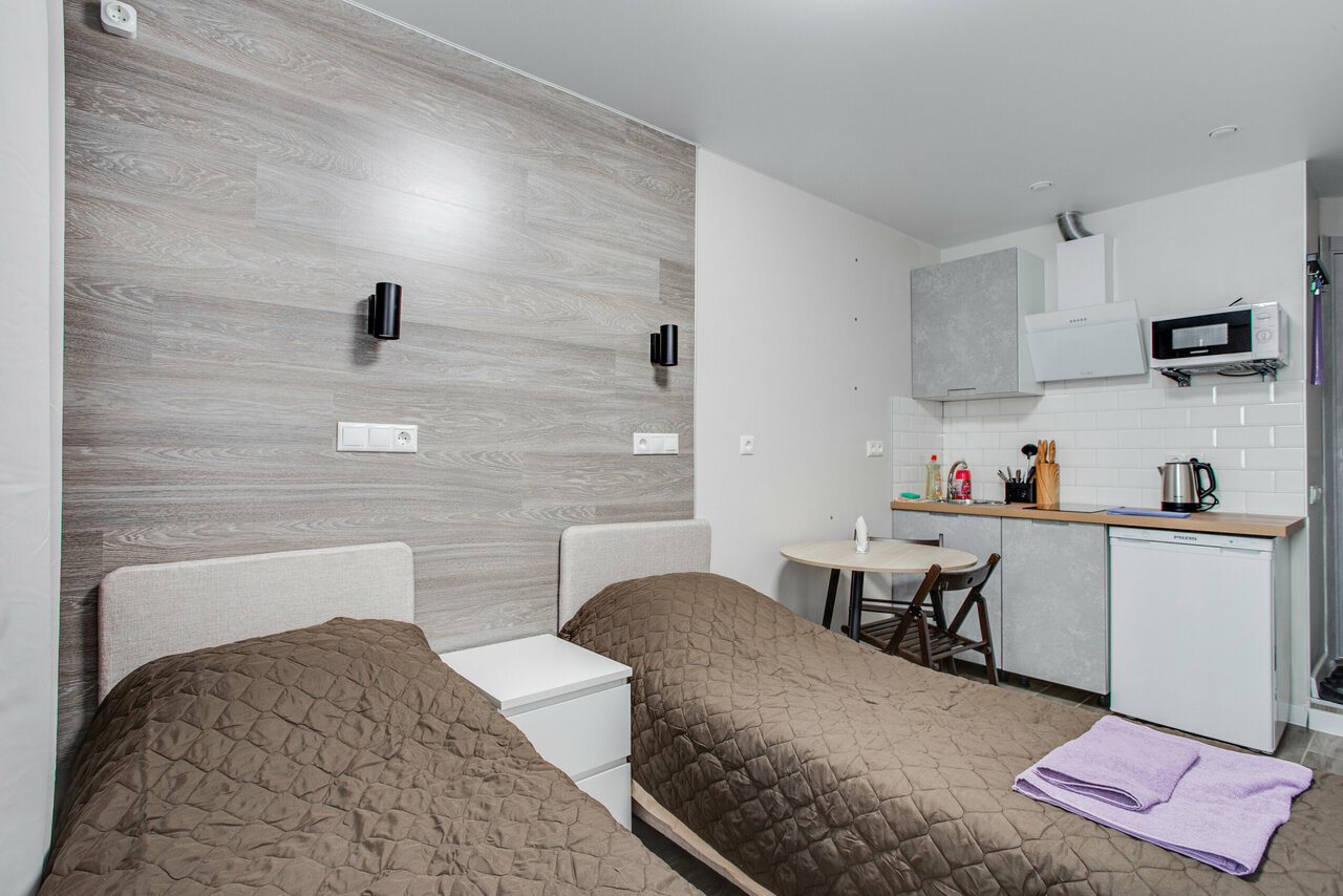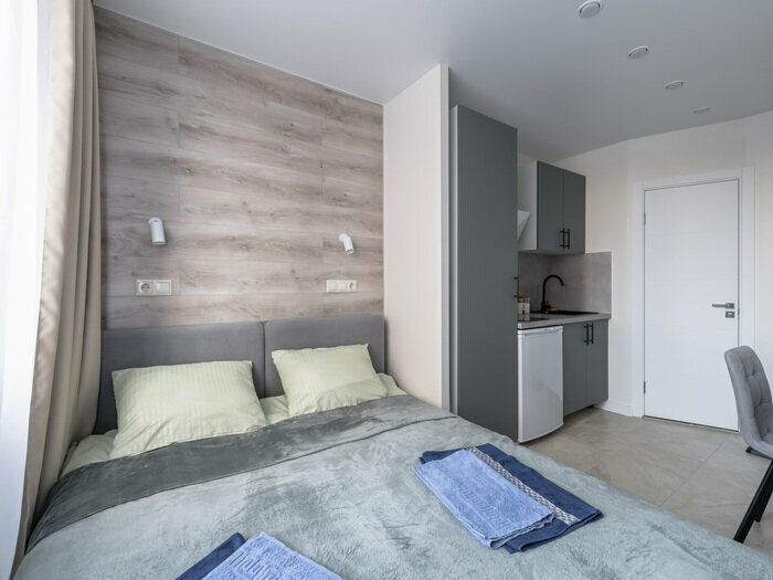 Быстрое бронирование, адекватная цена. Нужно внести залог 3000, который практически моментально возвращают (если вносить по СБП), договор аренды подписывается онлайн. Половинки студии, с отдельным крохотным санузлом и миникухней, есть холодильничек и посуда, двуспальная кровать, утюг и гладильная доска. Стиралка общая на две комнаты. Новостройка, лифт внутри отделан фанерой. Ключ в локере на стене, кодовый замок. Если бы не путаница при заселении, было бы идеально. В целом можно рекомендовать для командировок в Сколтех