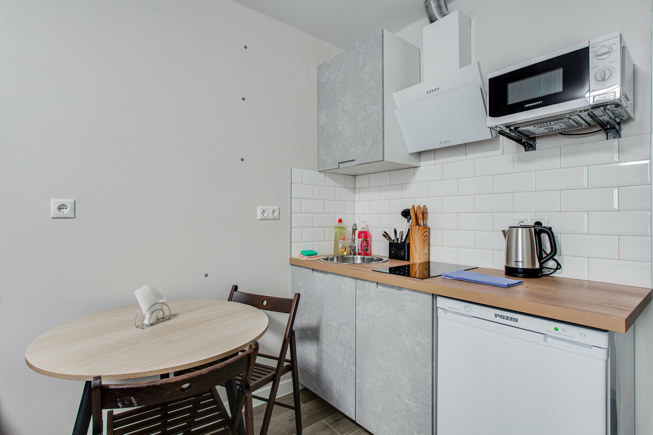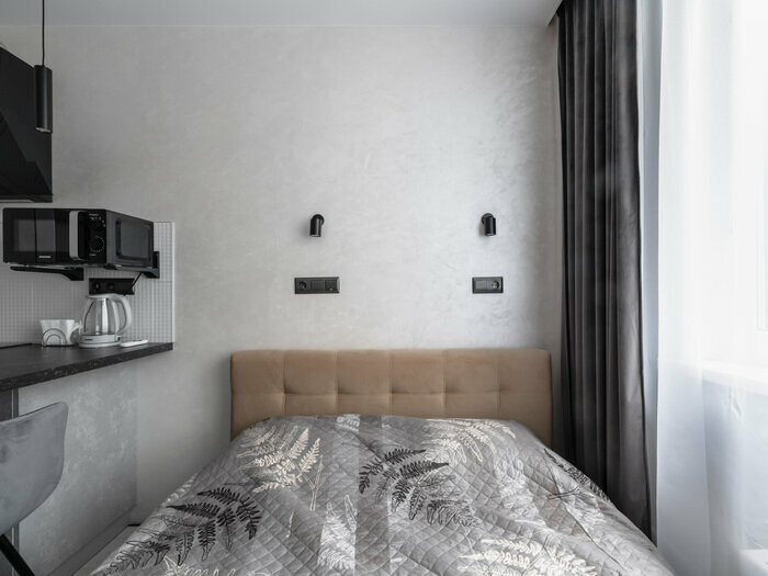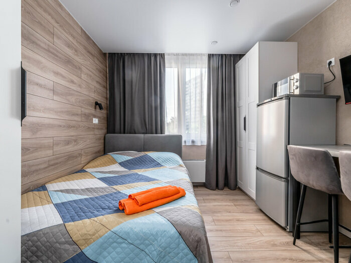 Маленькие, но очень приятные апартаменты со всем необходимым для жизни. Удобная кровать и подушки. Можно пользоваться стиралкой, она в общем коридоре на двое апартаментов. В апартаментах рядом со Сколково нет кондиционера, окна на юг и летом может быть очень жарко.