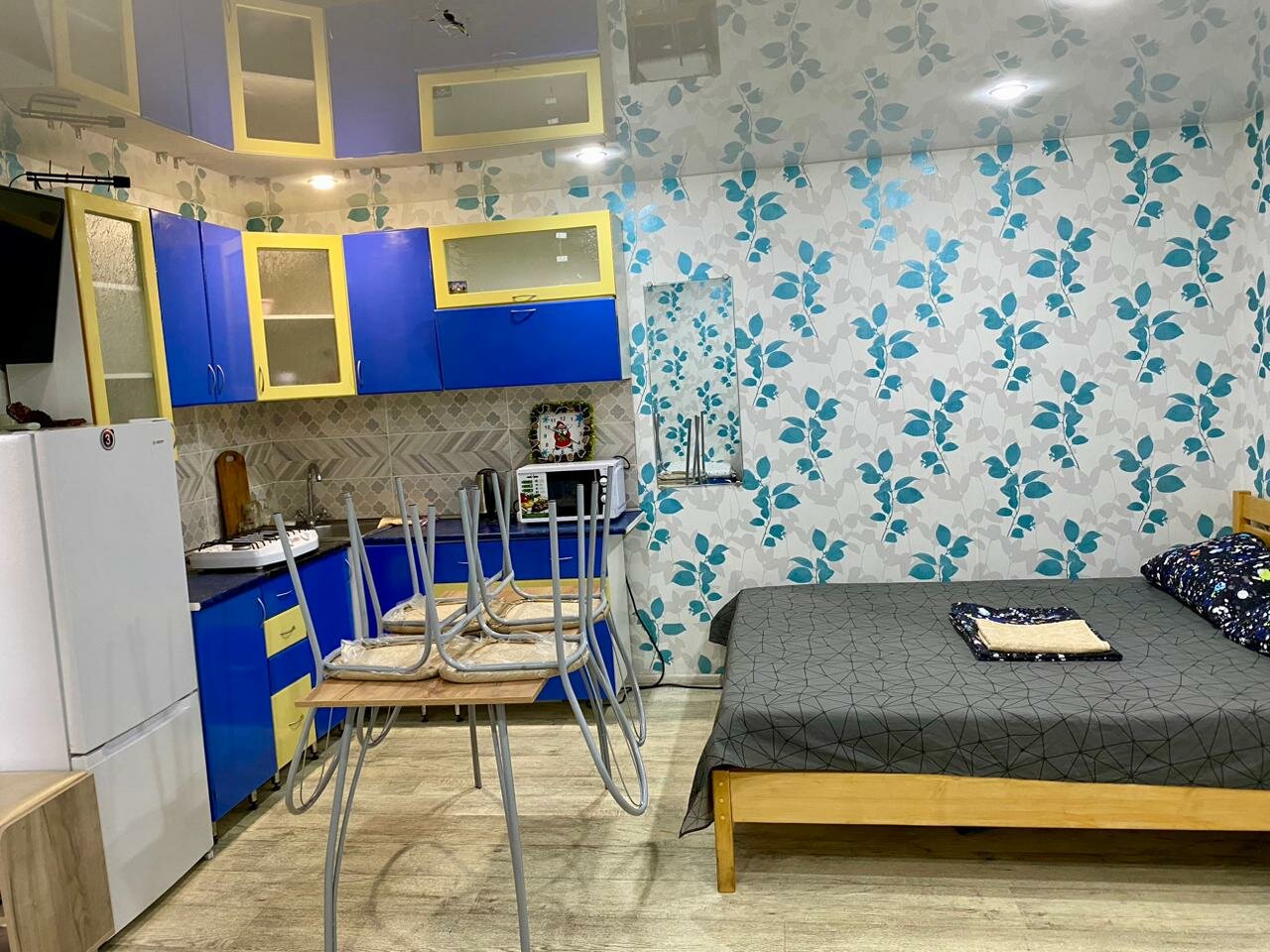 - Холодильник, микроволновка, кухонная зона.