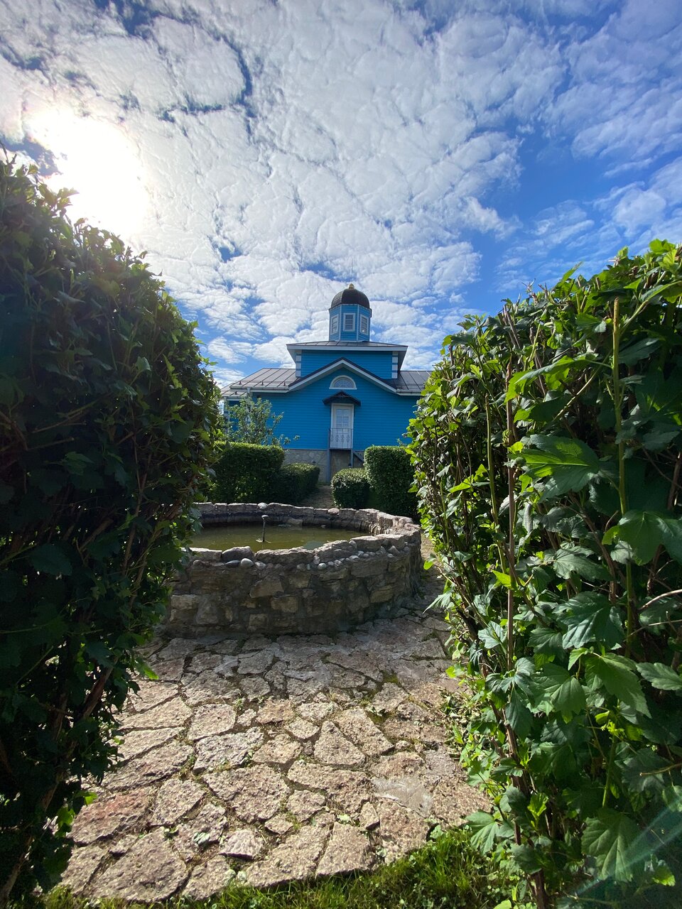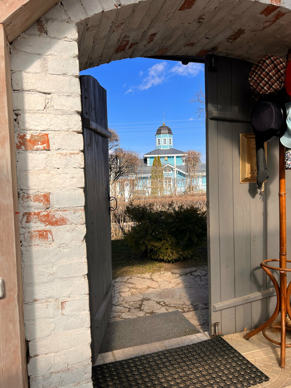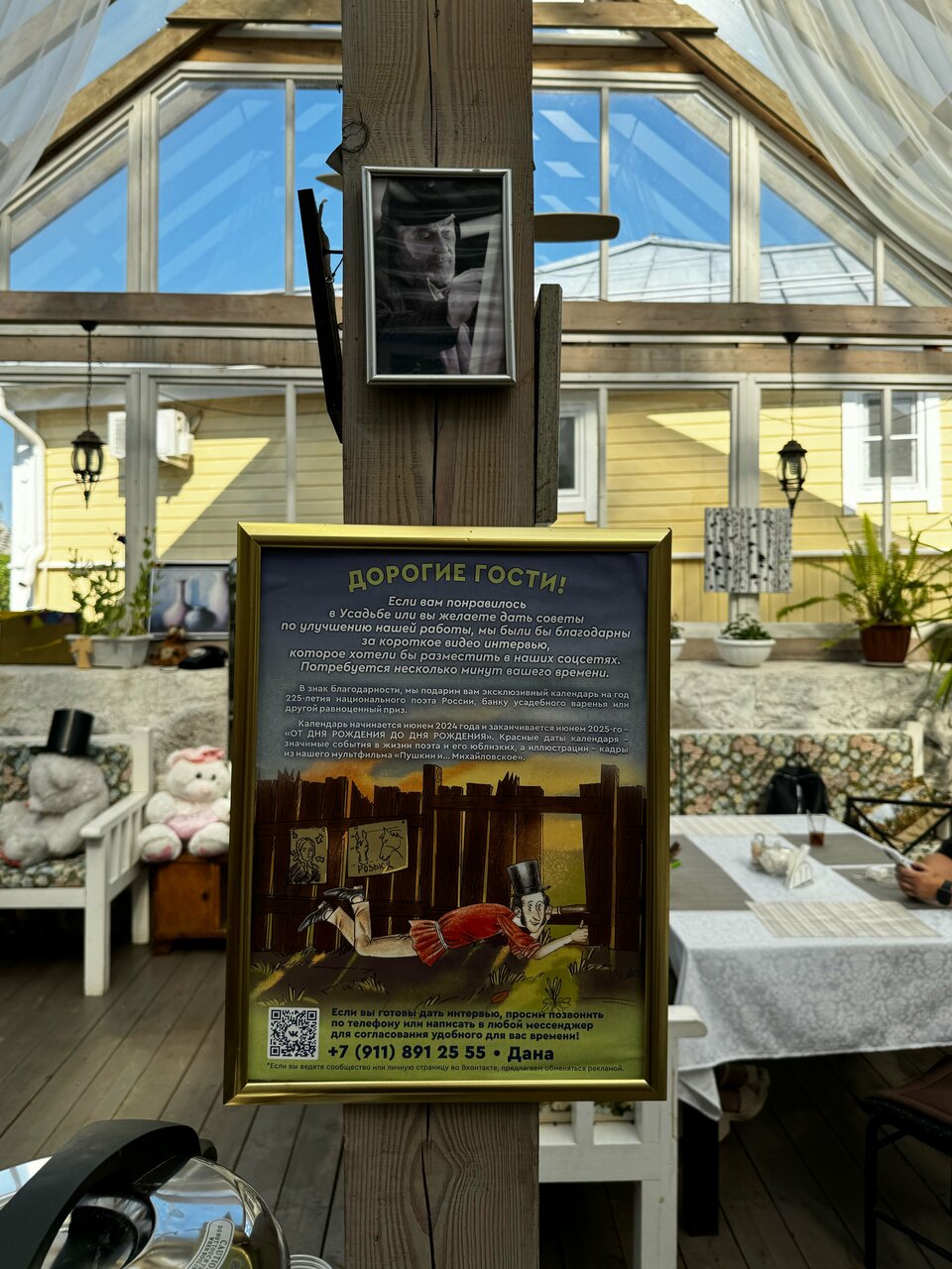 Когда оказываешься перед въездом : что-то типа ощущения как будто на дачу приехали) А вот уже на территории нас встретили две очаровательные псины , весьма человеколюбивые , внимательный персонал и необыкновенно уютная атмосфера самой усадьбы. Ресторан заслуживает отдельного внимания и похвалы, всё очень вкусно и по- домашнему. Очень увлекательные для рассматривания детали интерьера самой трапезной и ещё более неожиданное убранство туалетной комнаты. Для остановки при посещении Пушкинских мест — рекомендую.