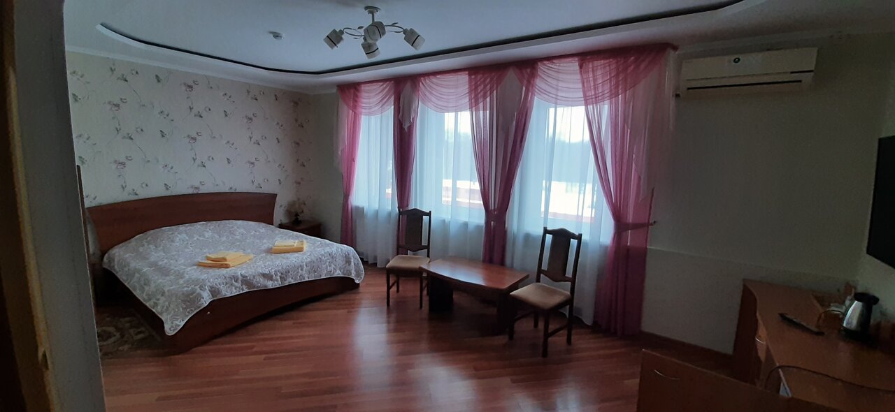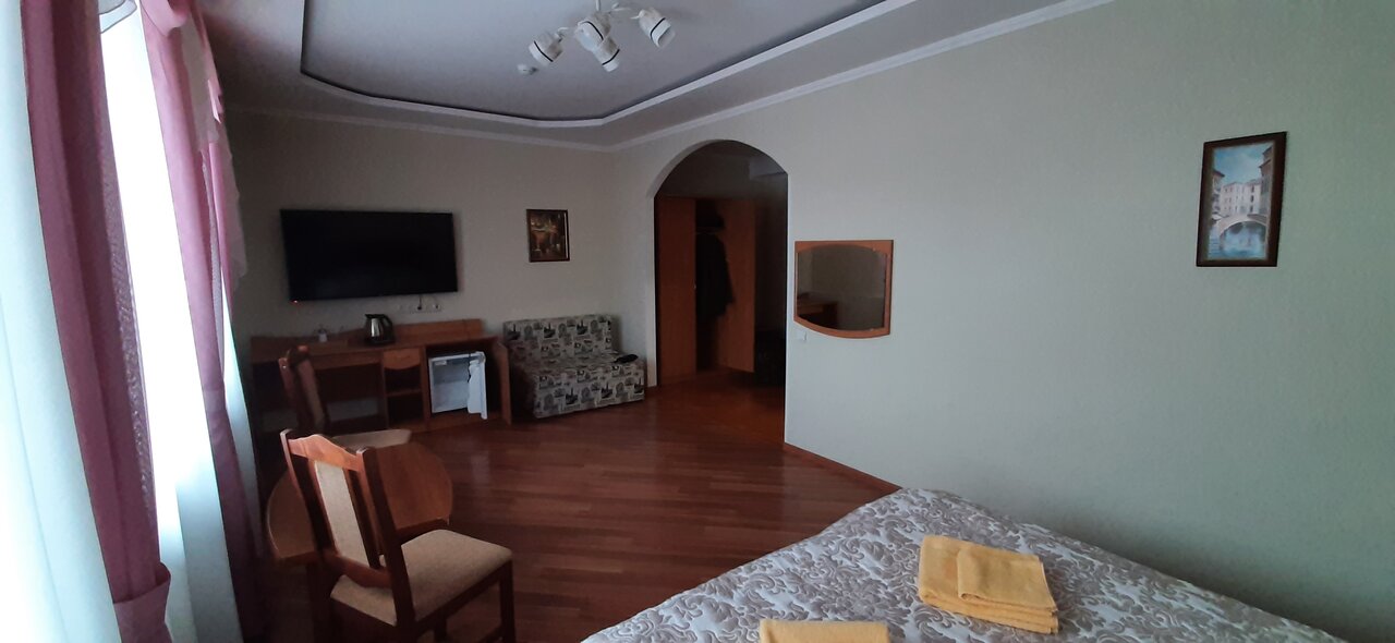 Номера повышенной комфортности, оборудованы двухспальной кроватью, диваном. Номер обрудован кондиционером, бесплатный Wi-Fi, холодильник, спутниковое телевидение. Прикроватные тумбочки, мебель необходимая для комфортного проживания, электрочайник и д