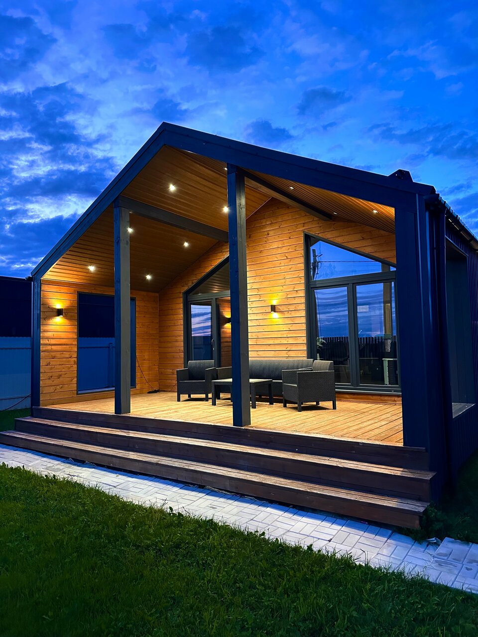 Новый стильный дом с панорамными окнами 70 кв.м. с просторной террасой в коттеджном посёлке Ропшинские высотыТерраса с мебелью 35 кв.м. Для 6 гостей (2+2+2) 2 уютные спальни и диван-кровать в просторной кухне-гостиной с панорамными окнами