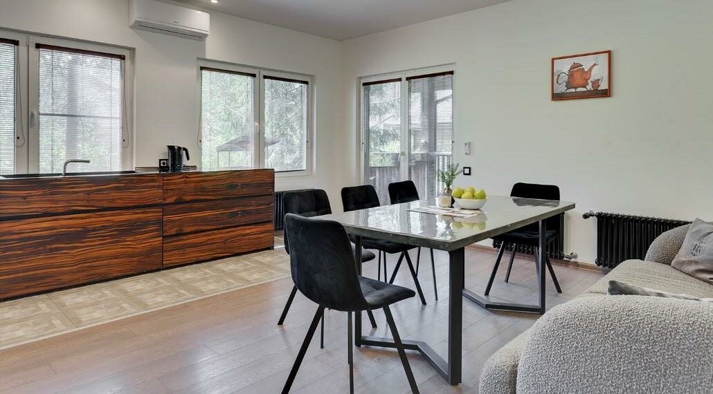 Хорошие дома, теплые. Даже жарко было. Есть мангал, 4 спальни, все принадлежности. Тарелки, вилки, бокалы. Все чистое и новое. Два больших телевизора, душ и ванна. Два туалета. Сама территория большая, есть спа , прокат машинок, ресторан. В общем отдых удался.