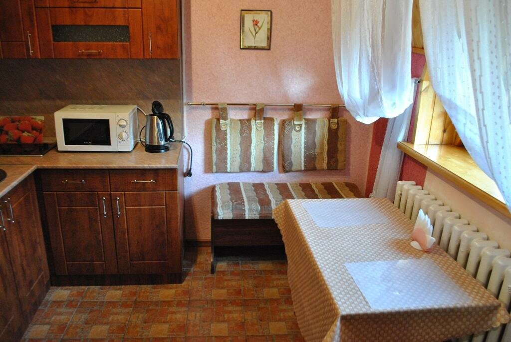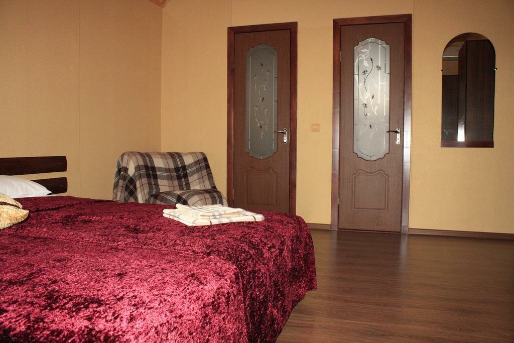 Дёшево, сердито. Номер-студия с кухней и двуспальной кроватью в сутки с завтраком обошёлся в 3300р. Чистота, красота, телевизор, халаты, ковёр на полу, живые цветы в горшках, шампунь и мыло, микроволновка, холодильник, чайник, плита, книжный шкаф с книгами. Стоянка для машин своя, оплата картой. Нужно иметь паспорт на каждый снимаемый номер. Если снимаешь два номера, то нужно два паспорта. На завтрак три фаршированных блинчика со сметаной. Кстати, вкуснейшие, особенно с яблоком и с творогом. Заселение не раньше 13 часов. Единственный недостаток — бумажные стены. Я слышала всё, о чем говорили мужики сверху. Надеюсь в свою очередь, мы с мужем им не очень мешали.
