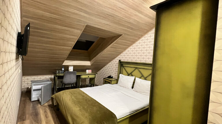 Комфортабельный однокомнатный номер с двуспальной кроватью. Собственная ванная комната, WiFi, Спутниковое TV, рабочий стол, платяной шкаф, холодильник, фен, туалетные принадлежности.