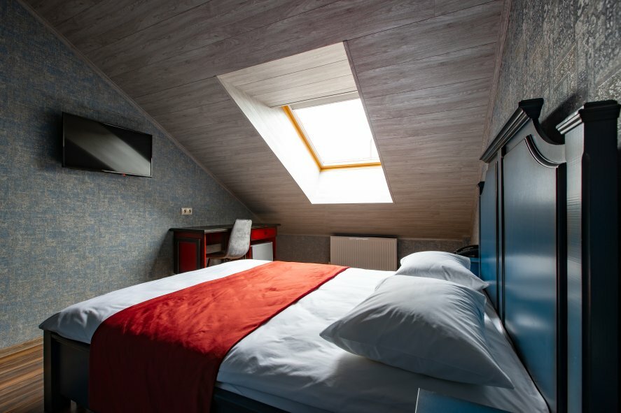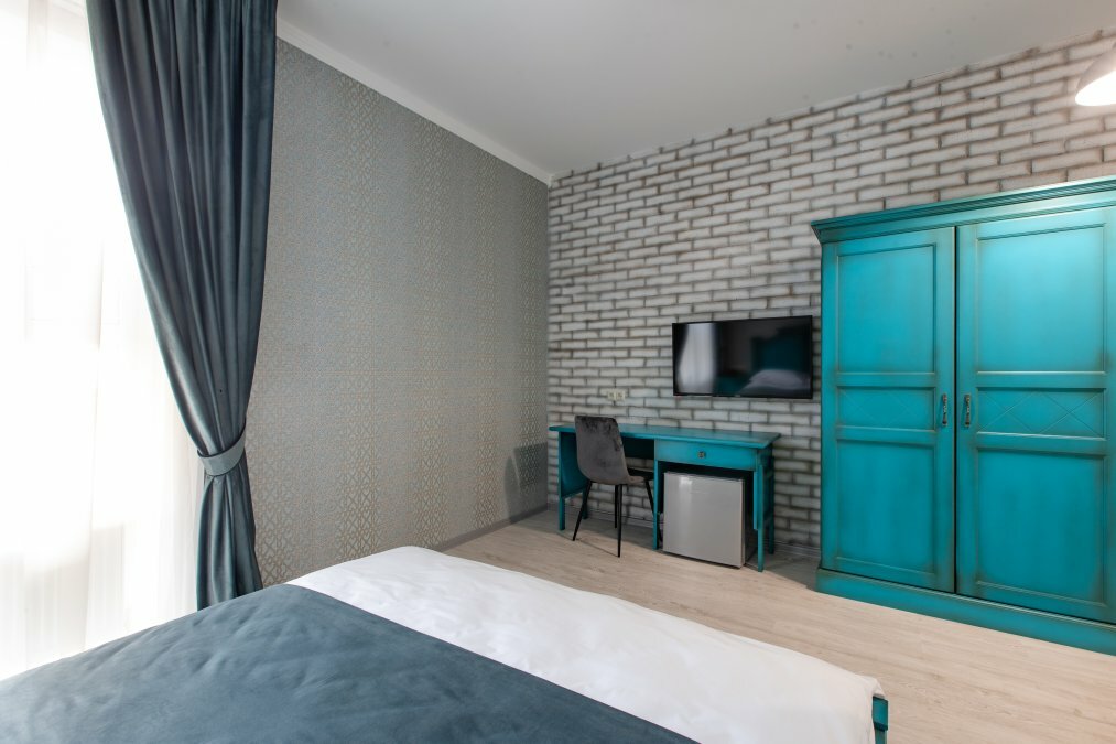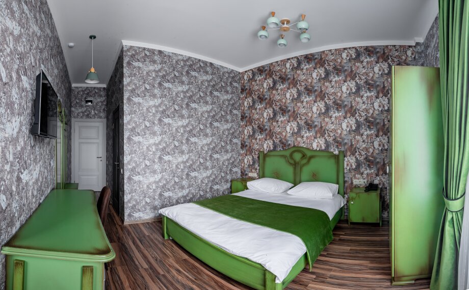 Яркий, просторный однокомнатный номер, оформленный в современном стиле категории Бизнес с двуспальной кроватью. Собственная ванная комната, WiFi, Спутниковое TV, рабочий стол, платяной шкаф, холодильник, фен, туалетные принадлежности.