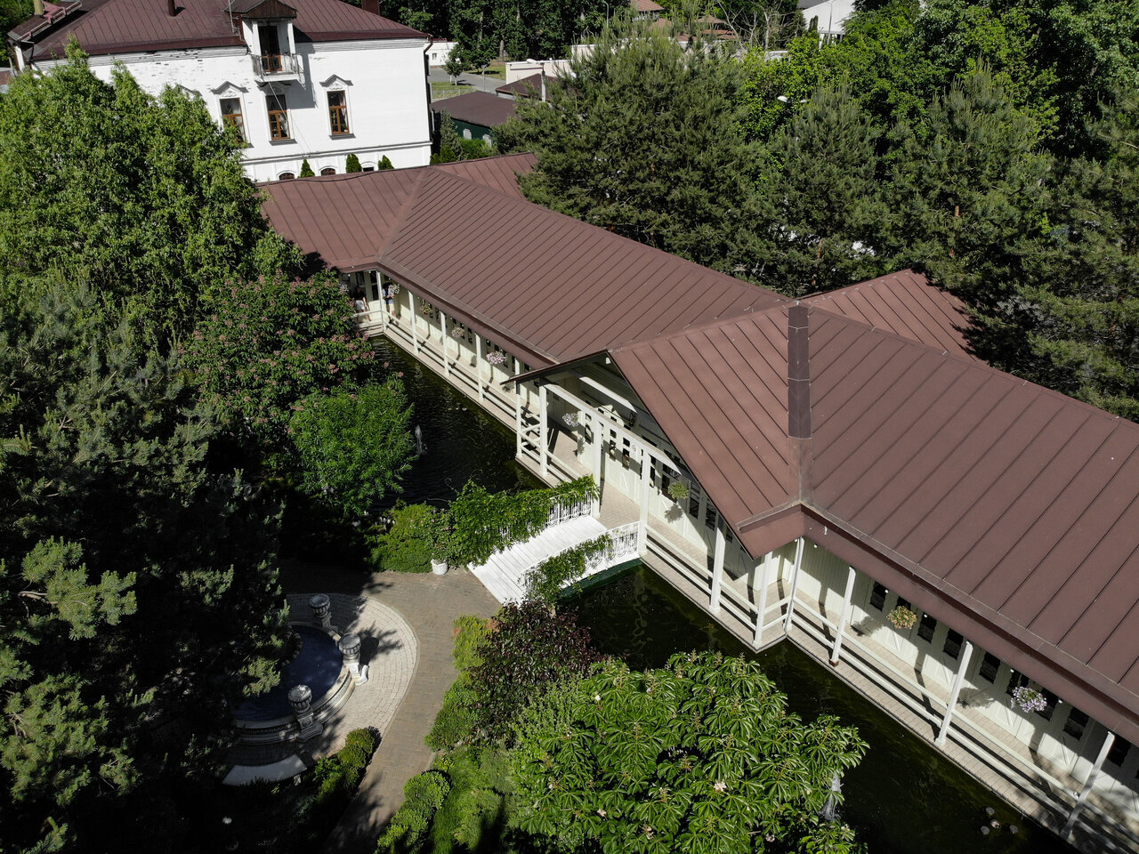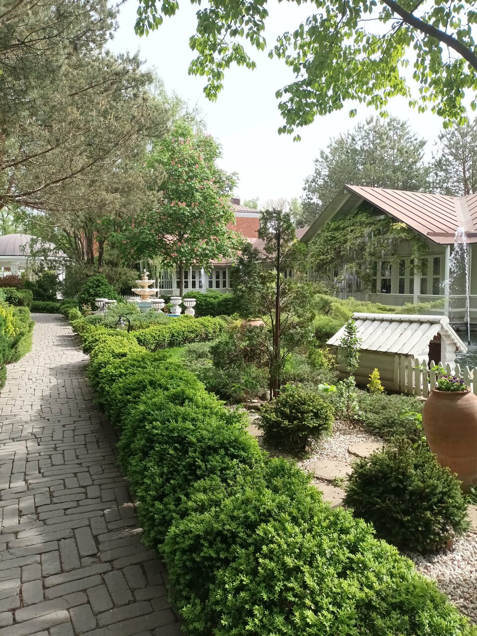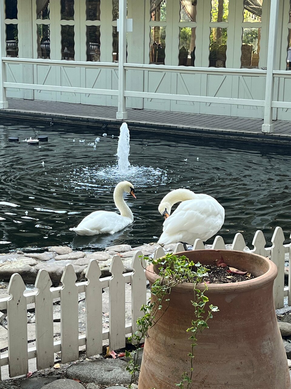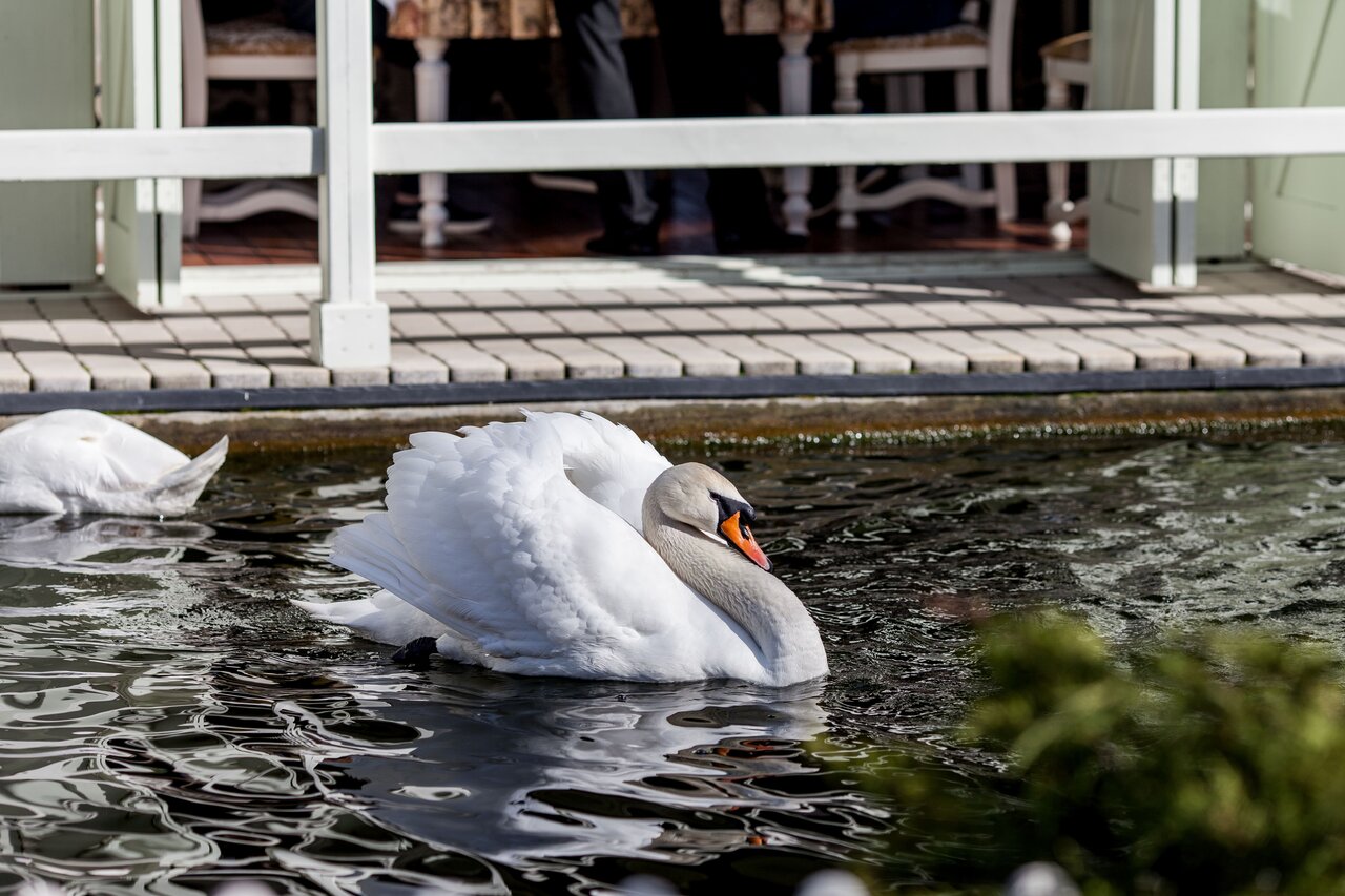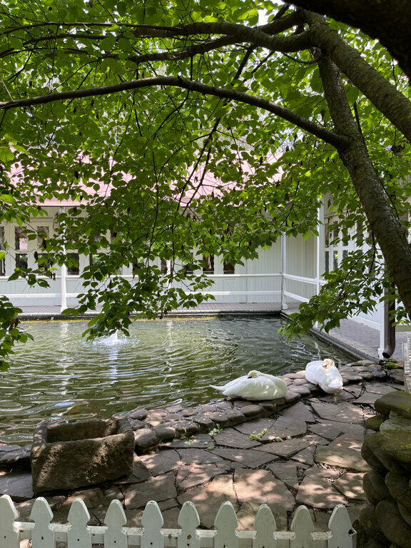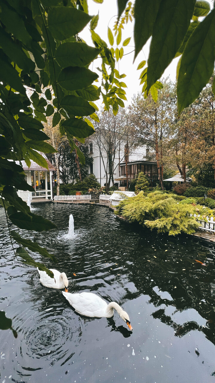 - Ухоженная территория с фонтанами и лебедями.