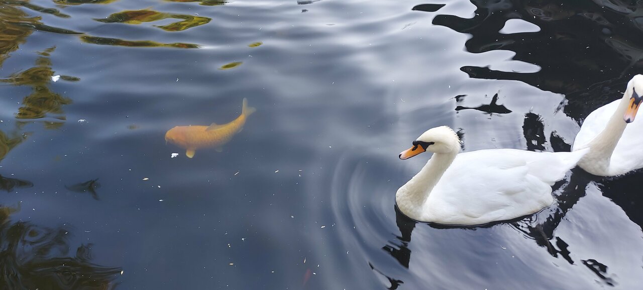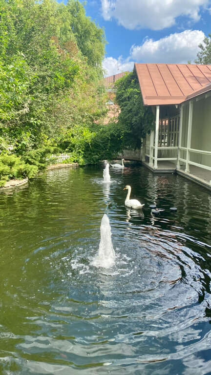 Уютное место для отдыха. В пруду плавают лебеди и разноцветные карпы, много зелени. Еда вкусная