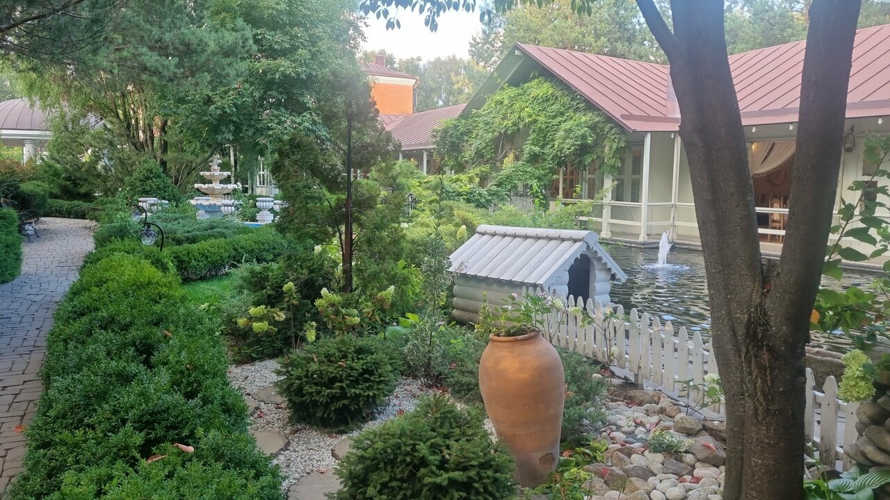 - Красивая территория.; Разнообразие в меню ресторана.; Красивые интерьеры.; Живописное место для завтрака (сад, пруд).; Ухоженная территория с фонтанами и лебедями.