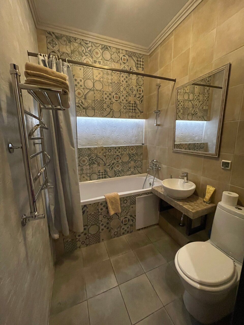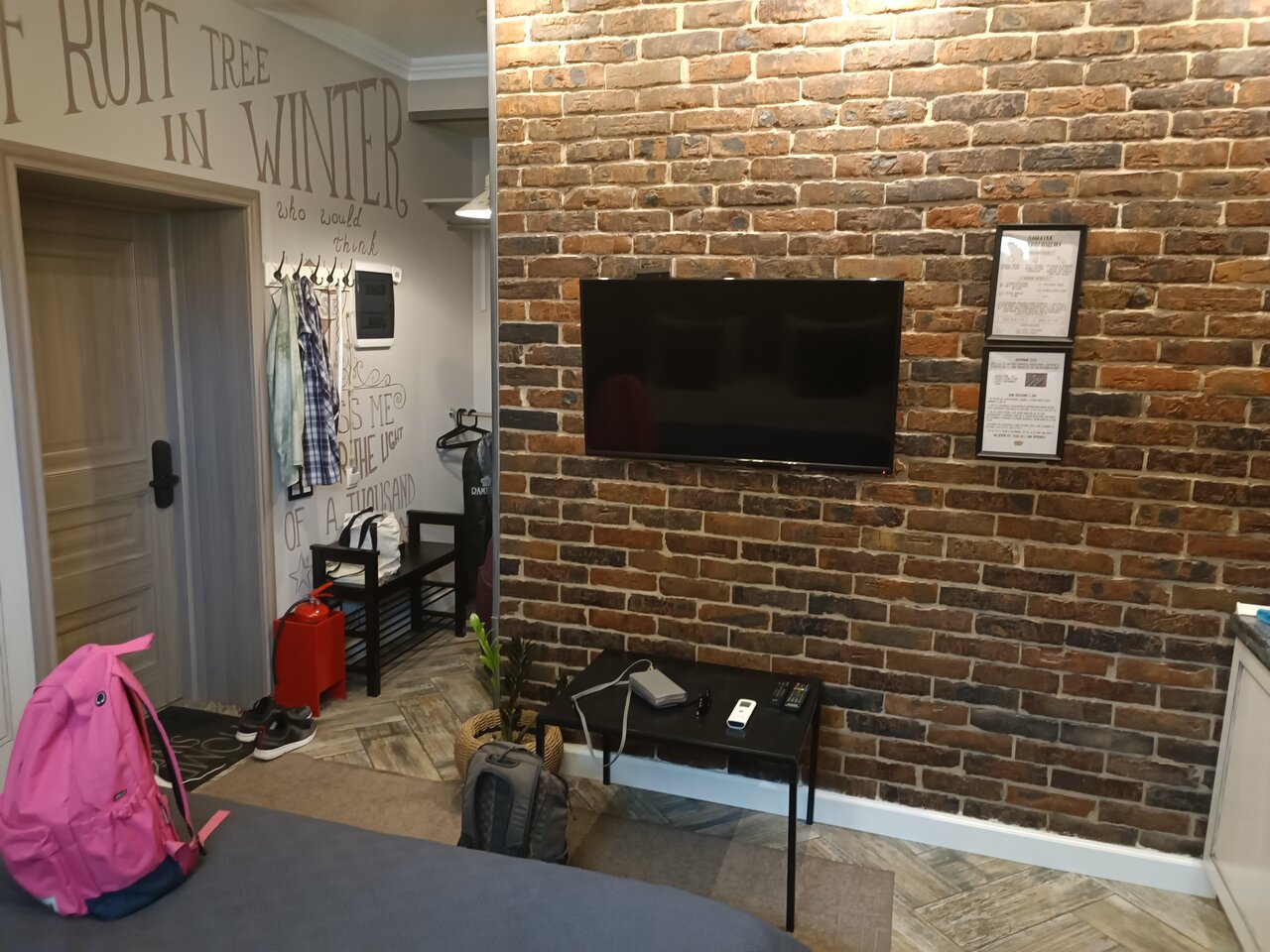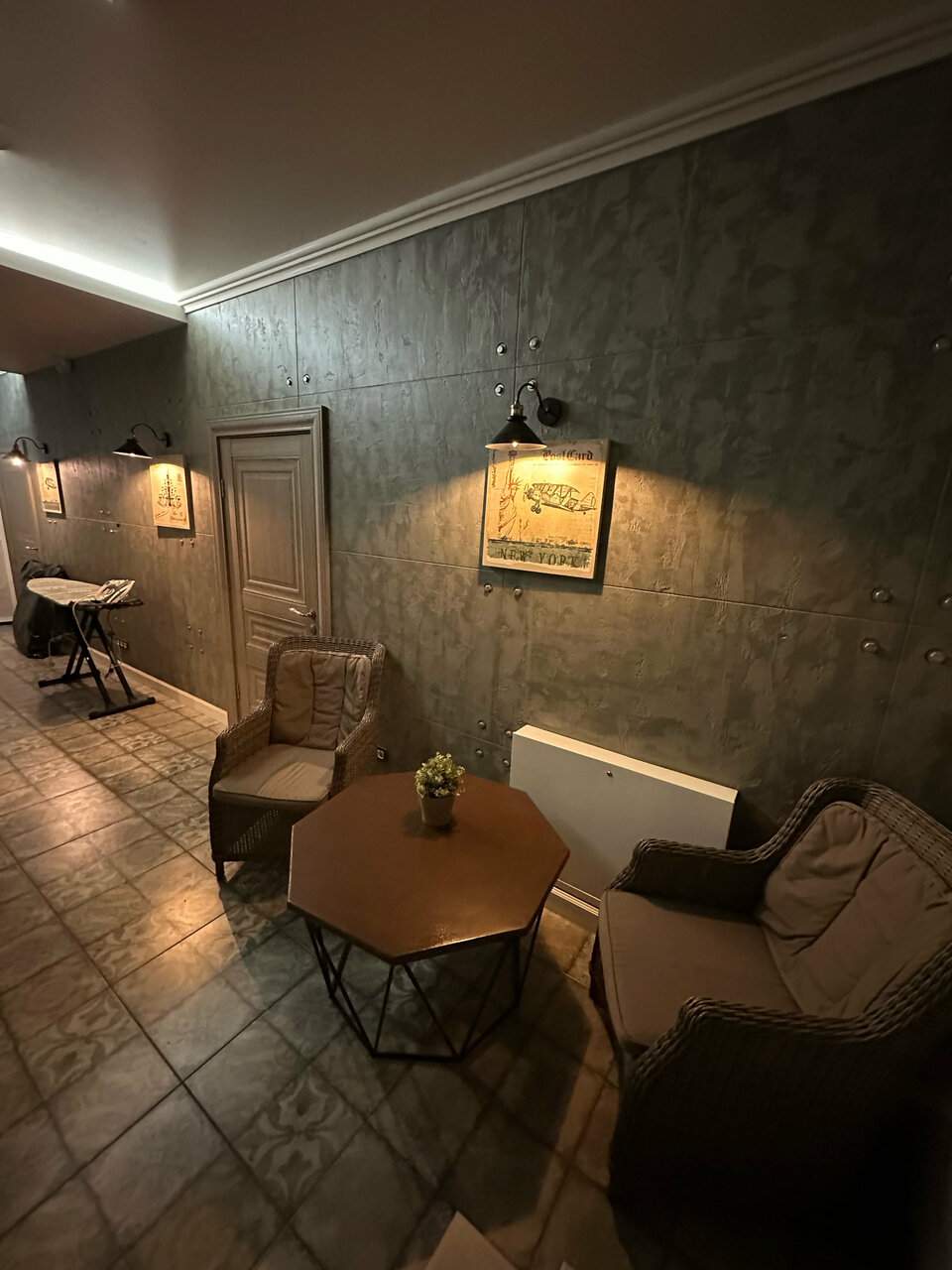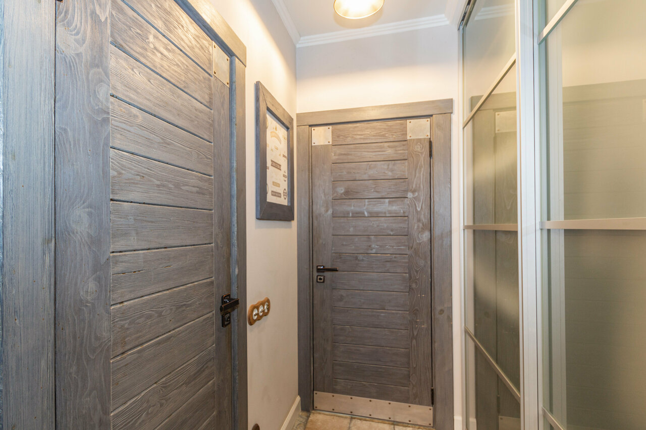 Интерьер очень теплый и уютный. Чисто и всё, что нужно для быта. Интернет хороший . Тв и проекторы в номерах — класс. Санузлы — очень чистые, смесители — будто вчера поставленные.