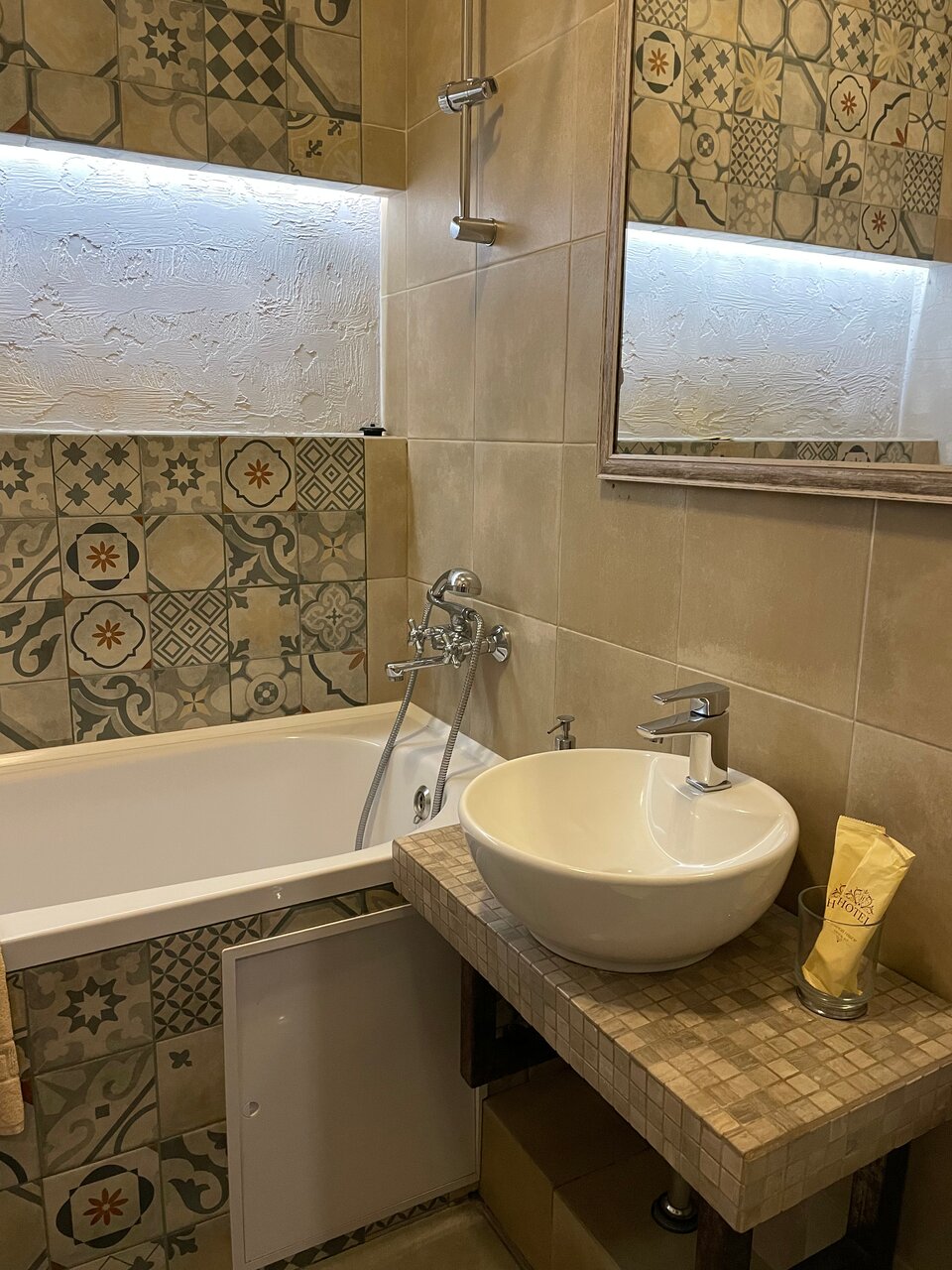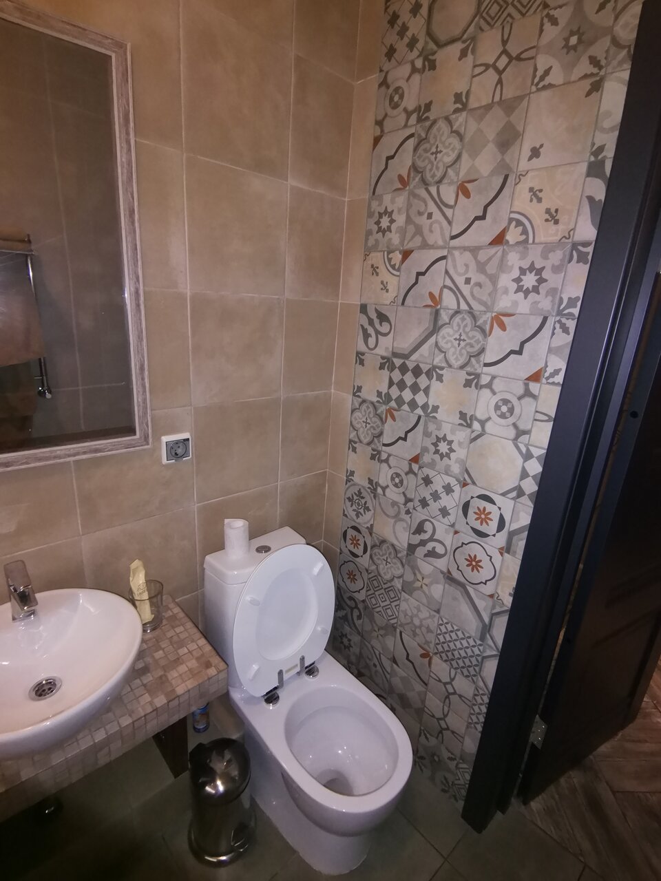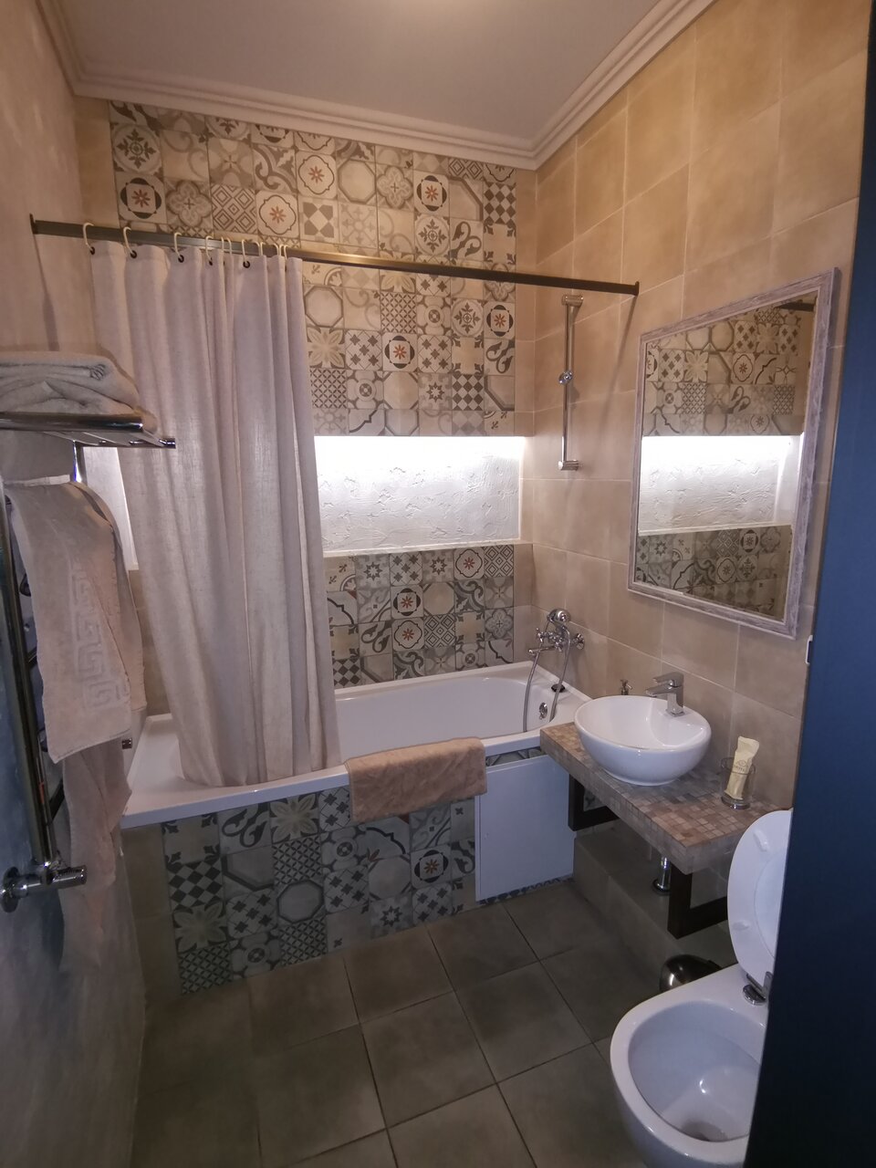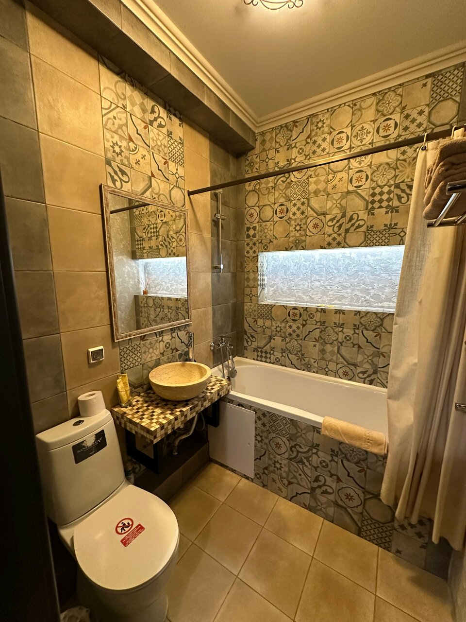 Интерьер очень теплый и уютный. Чисто и всё, что нужно для быта. Интернет хороший . Тв и проекторы в номерах — класс. Санузлы — очень чистые, смесители — будто вчера поставленные.